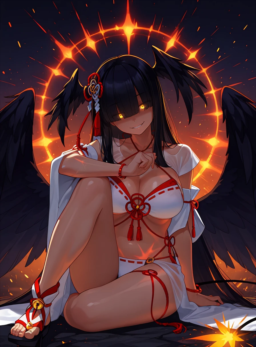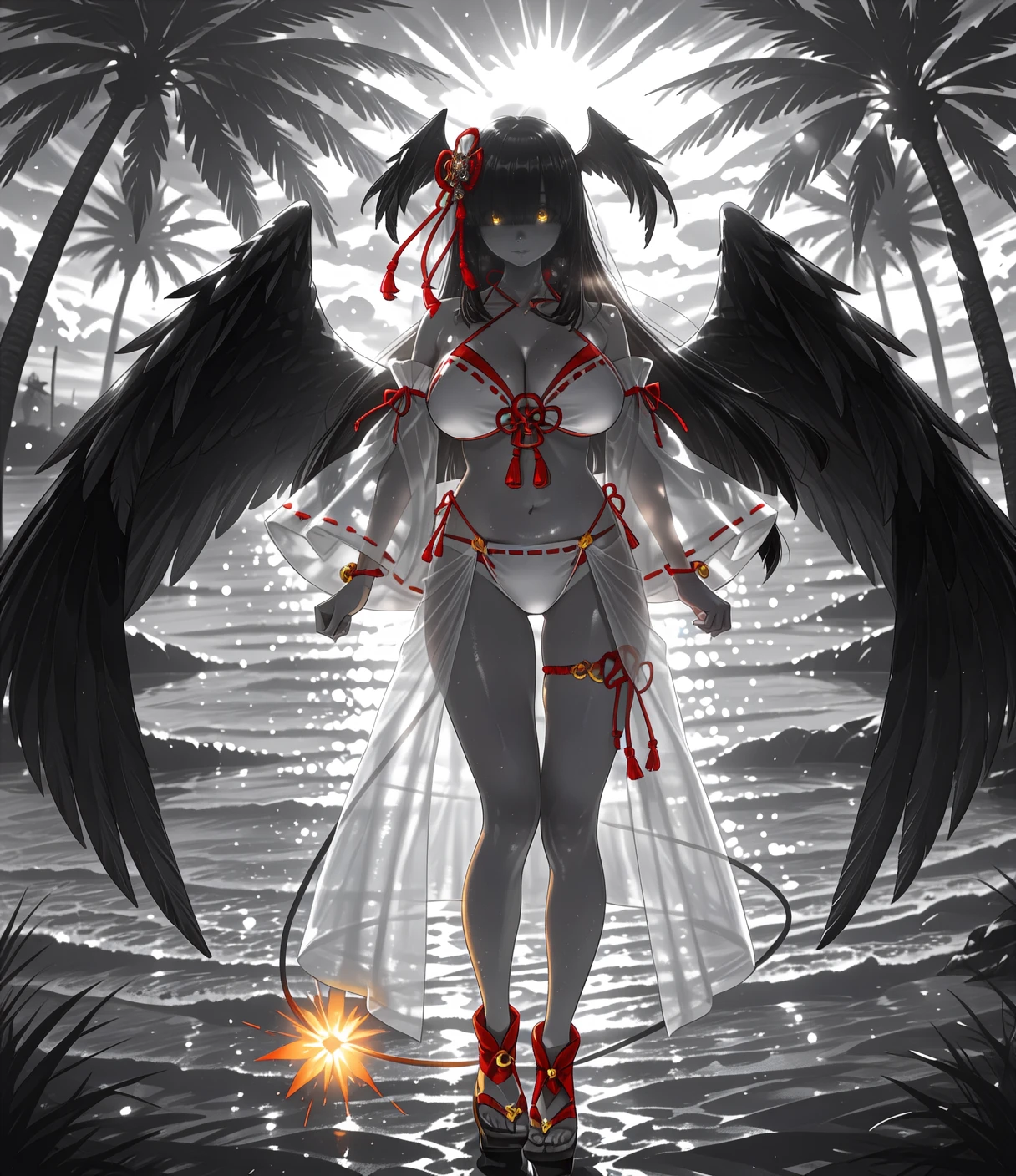h1r0swim, yellow eyes, black hair, long hair, blunt bangs, head wings, hair over eyes, eyes visible through hair, hair ornament, large breasts, cleavage, halterneck, two tone bikini, white bikini, red bikini, red tassel, red bracelet, detached sleeves, short sleeves, wide sleeves, jingle bell, red ribbon trim, thigh strap, see-through, geta, fuse tail, black wings, feathered wings,