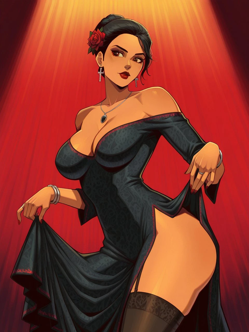 acc: (red) hair flower, makeup, lipstick, bangle, thighhighs
