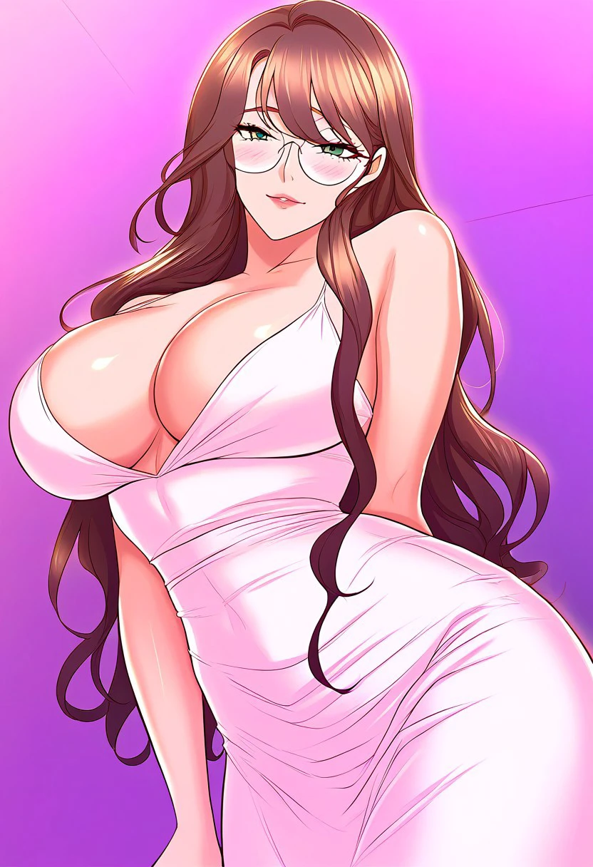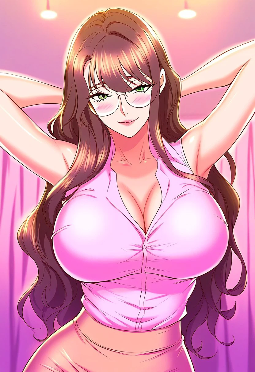 (( <lora:ballet_professor_dance_department:1> , ballet_professor_dance_department, thin waist, wide hips, beautiful skin, piercing green eyes, clear eyes, bright pupils, beautiful eyes, beautiful brown hair, beautiful long hair, bangs, huge and shaggy breasts, natural beauty, extraordinary beautiful woman, attractive woman, super sexy woman, lustful body, sexy woman with seductive obscene body, sensual body, voluptuous body, sexy beauty, no piercings, no piercing, big round glasses, ))