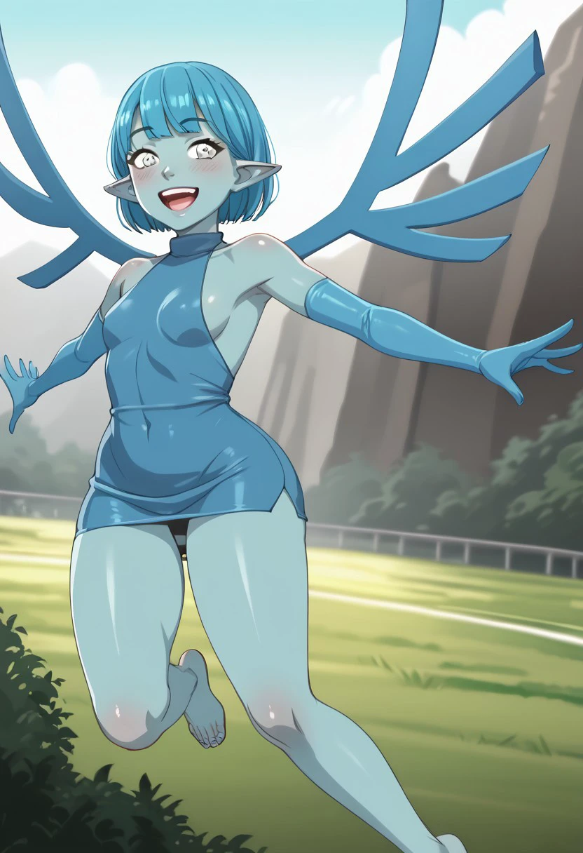 Al_MC, 1girl, wings, blue hair, short hair, blue skin, colored skin, grey eyes, blue dress, turtleneck sleeveless, backless dress, short dress, blue gloves, elbow gloves, pointy ears, solo