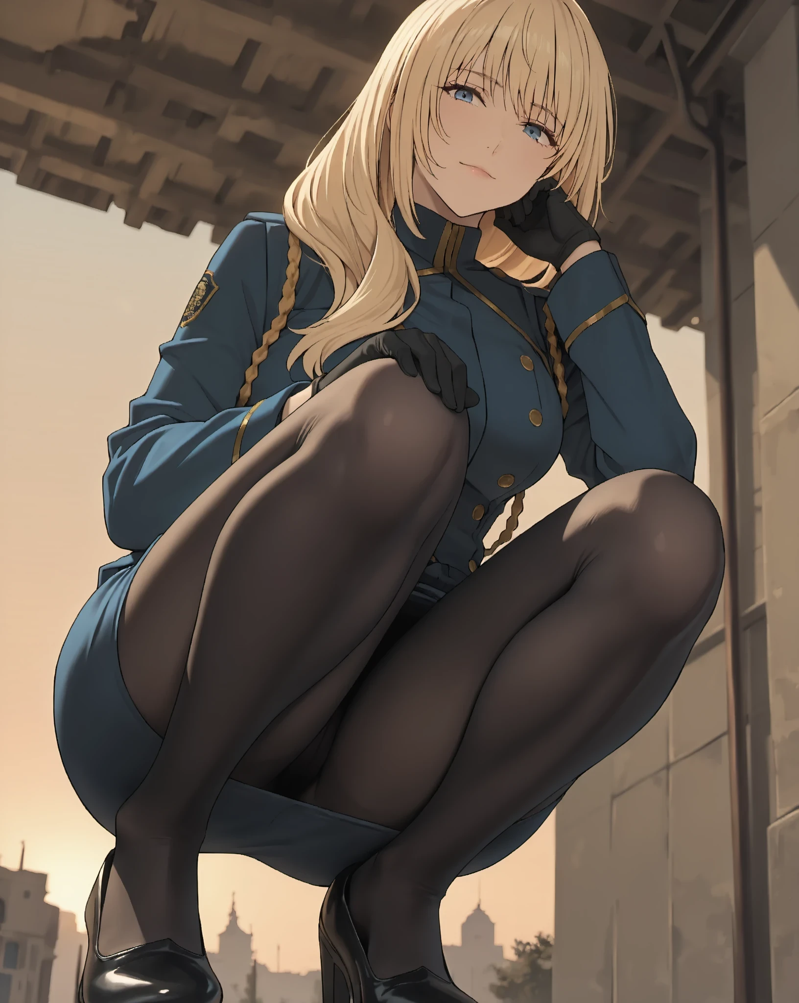blue military, uniform, pencil skirt, black gloves, black pantyhose, black shoes,