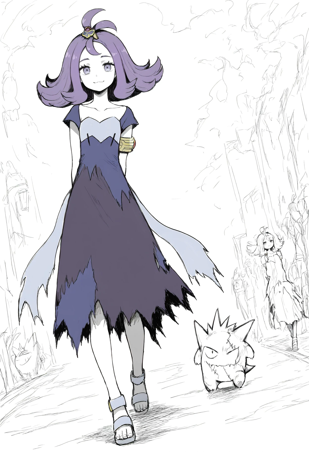 hair ornament,stitches,dress,armlet,sandals,topknot,multicolored clothes,torn dress,multicolored dress,torn clothes,short sleeves,grey dress,hairclip,purple dress,purple footwear,flip-flops