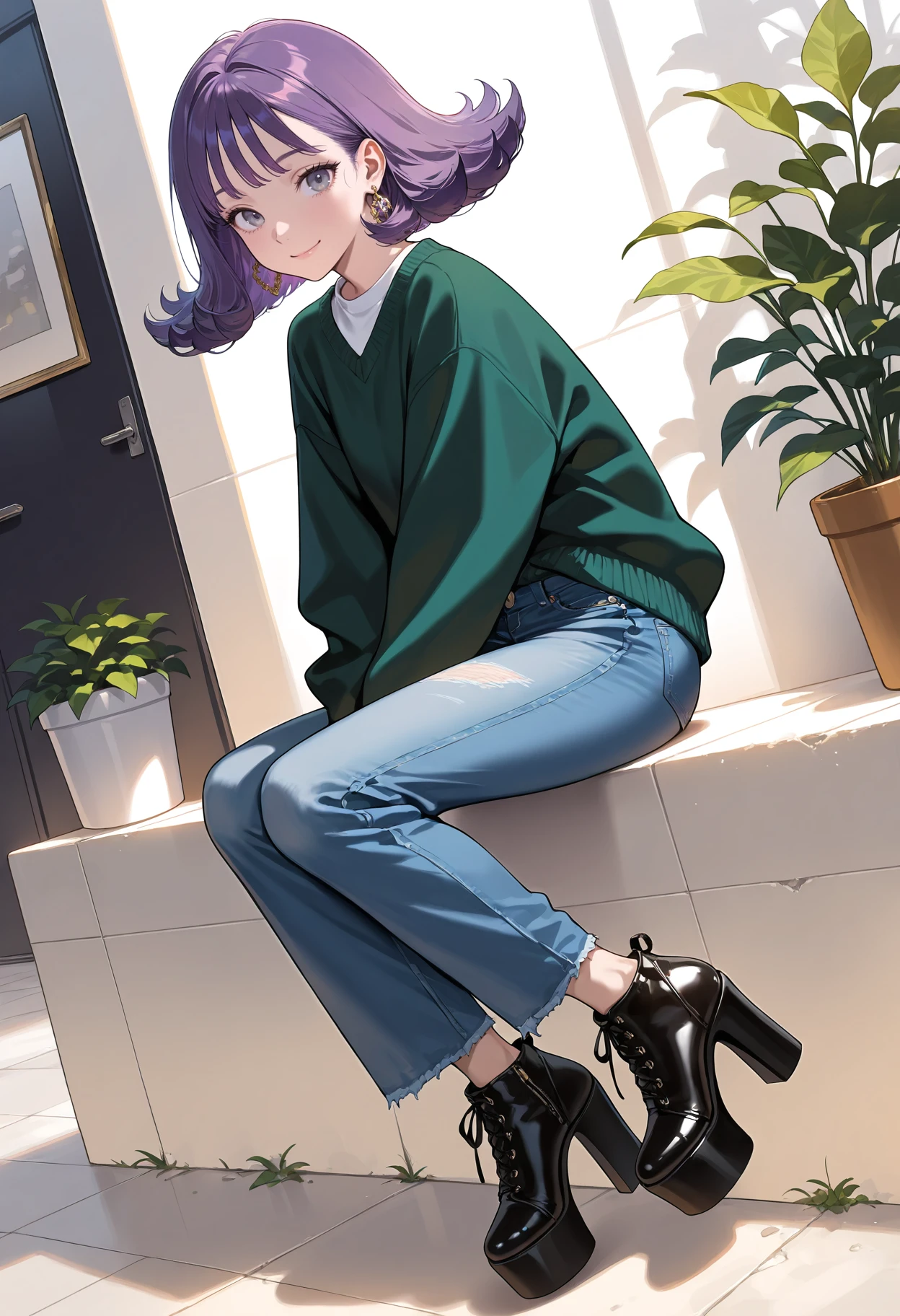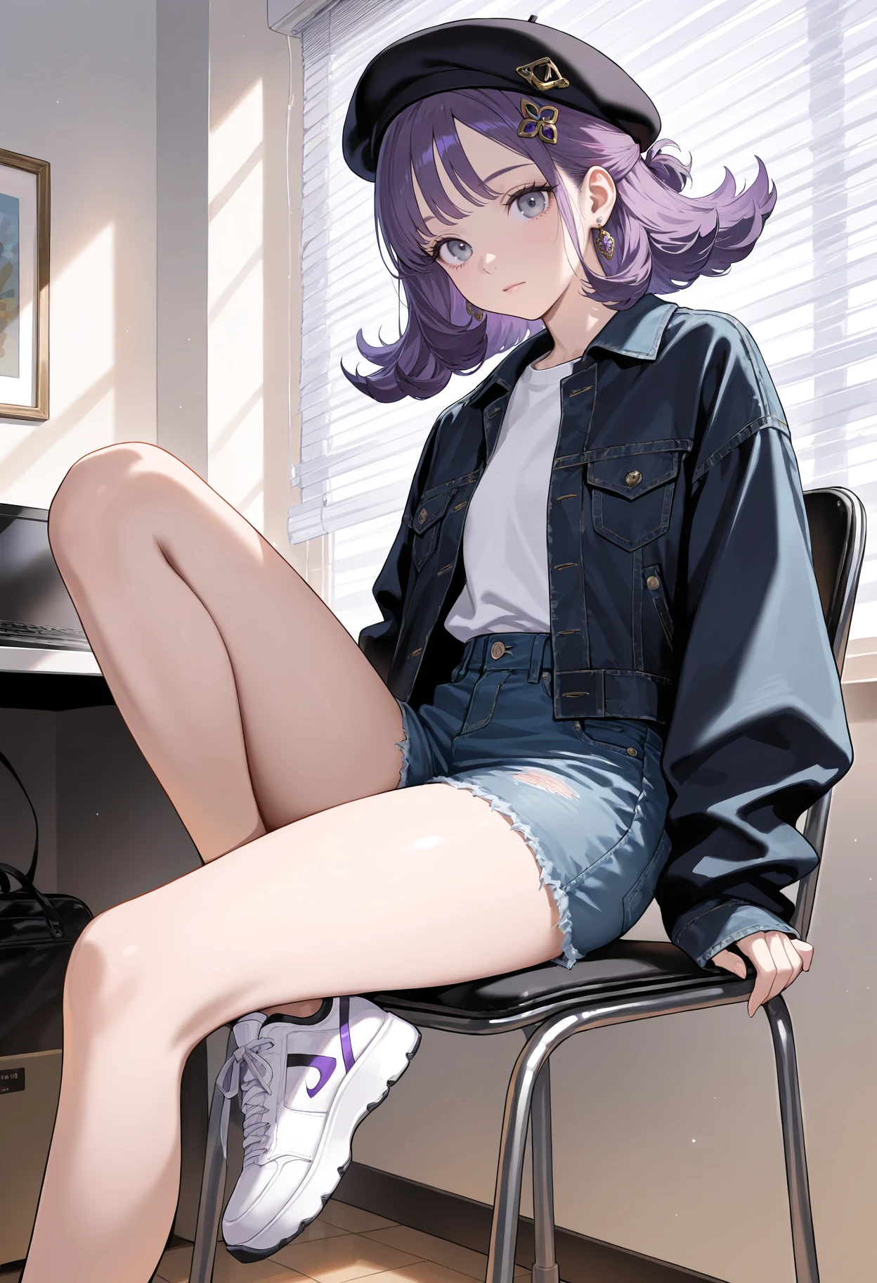 1girl,eyelashes,grey eyes,purple eyes,purple hair,short hair,medium hair,flipped hair,bangs