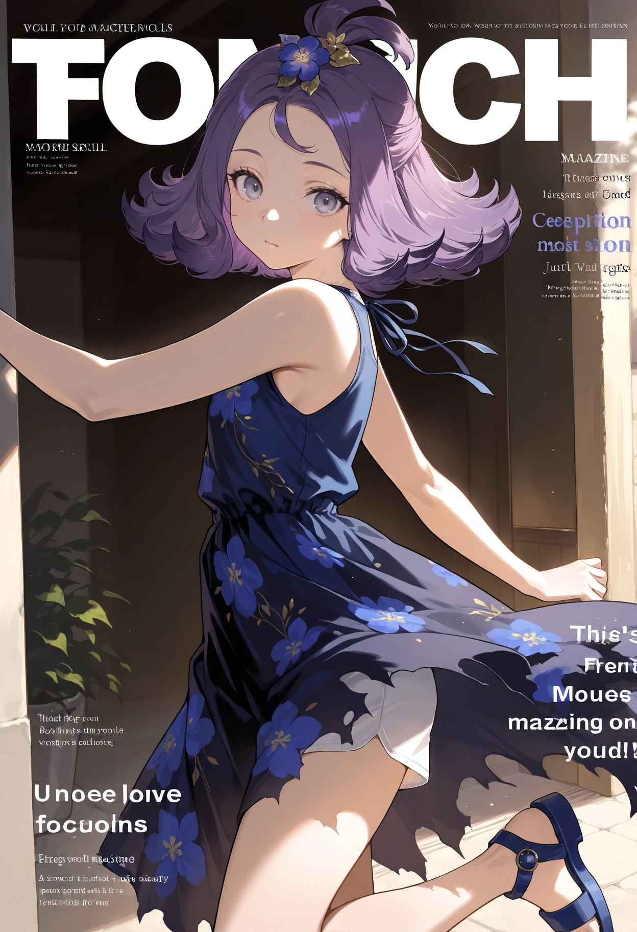 half updo,hair ornament,hair flower,shorts,topknot,sleeveless,dress,multicolored clothes,stitches,multicolored dress,shirt,alternate costume,sleeveless shirt,blue footwear, arms,torn clothes,blue dress,skirt,floral print,official alternate costume,sandals