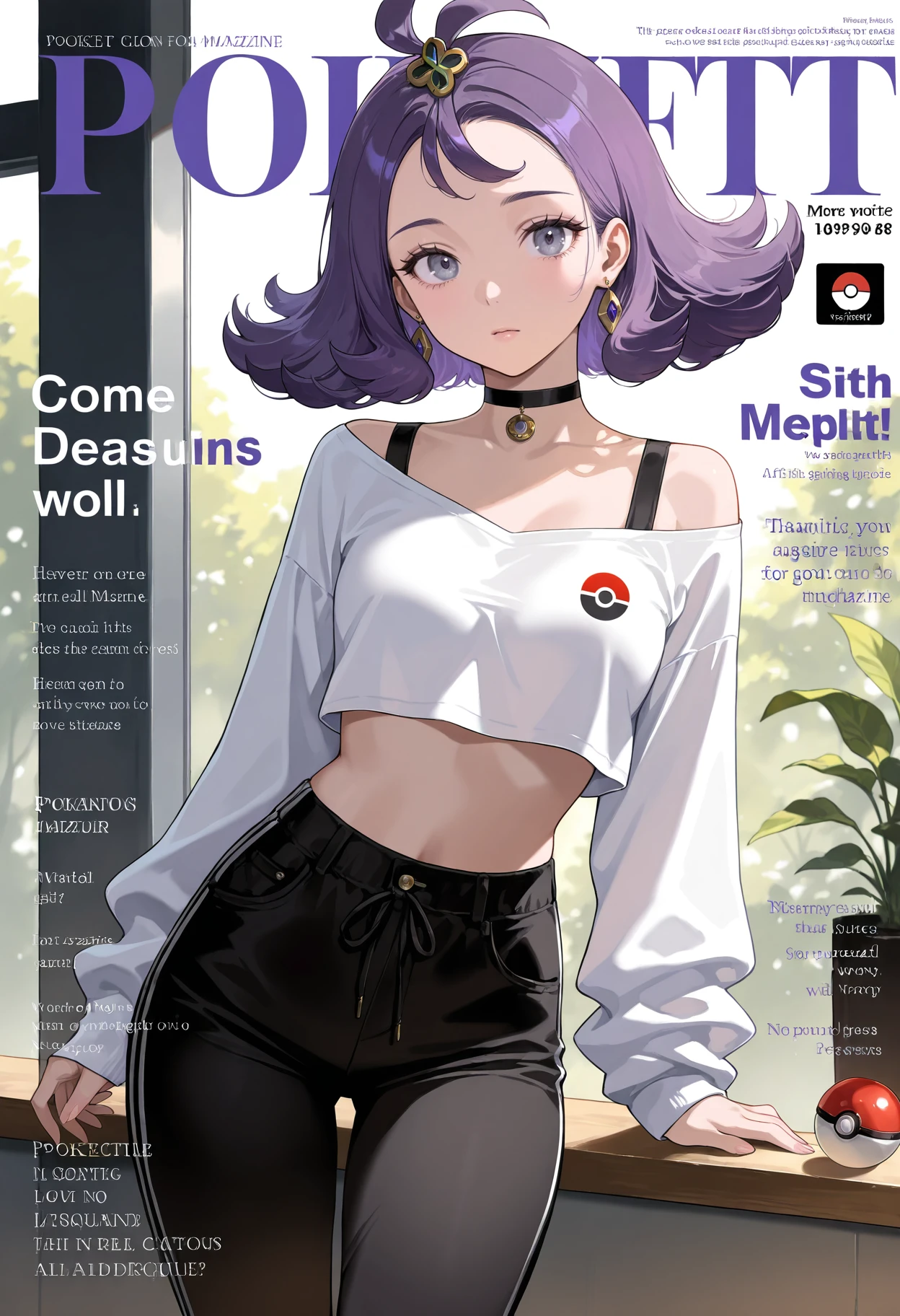 antenna hair,topknot,earrings,hair ornament,jewelry,pants,choker,crop top,black pants,long sleeves,midriff,shirt,white shirt,off shoulder,black choker,off-shoulder shirt,hairclip,poke ball symbol,breasts,casual,alternate costume