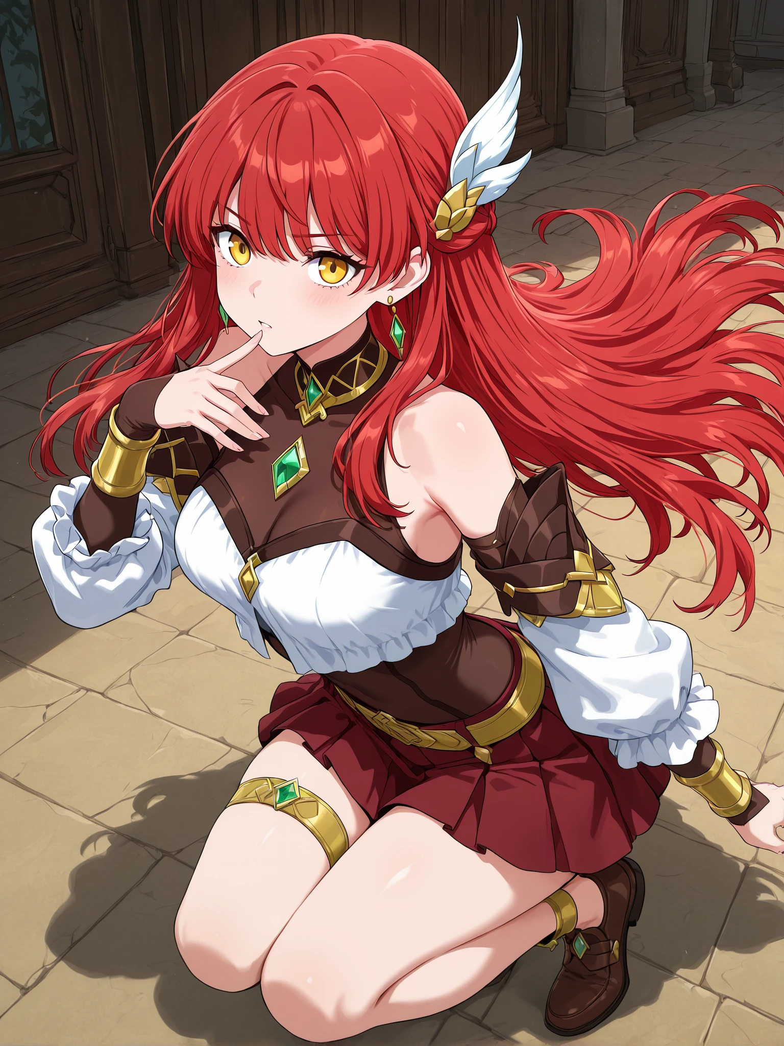 hair accessories,yellow earring,neck gemstone,white blouse,brown bodystocking,detached sleeves,white sleeves,brown elbow to wrist sleeves,golden wristbands,green gemstone,chest gemstone,yellow belt,belt gemstone,short skirts,yellow thigh band,thigh band gemstone,