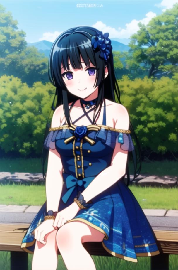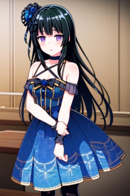slight worry , black_hair, blue_bow, blue_dress, blue_flower, blue_ribbon, blue_rose, bow, collarbone, dress, flower,hair_flower, hair_ornament, long_hair