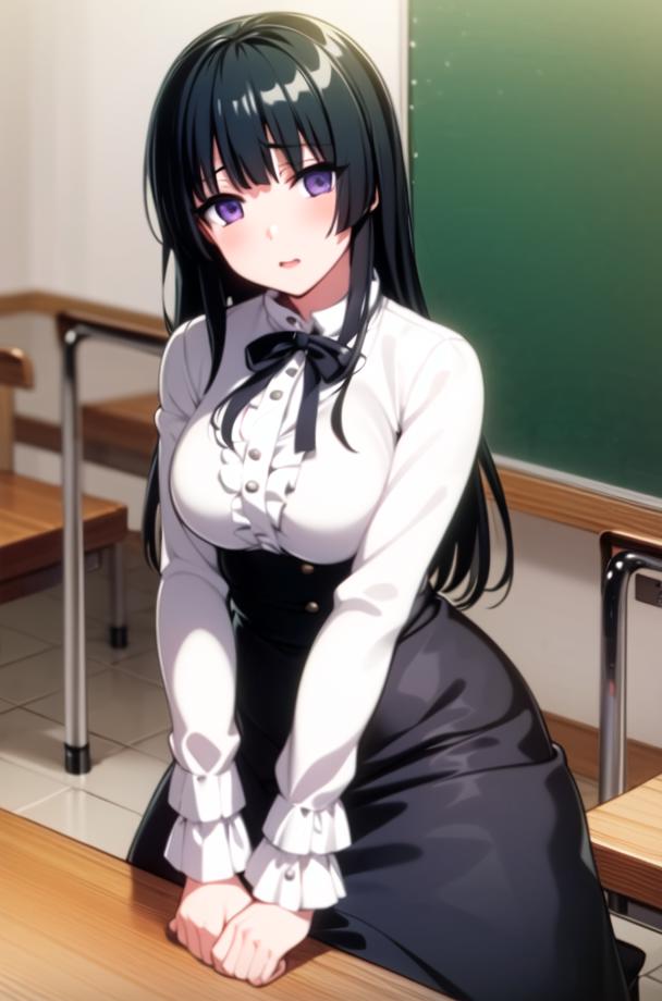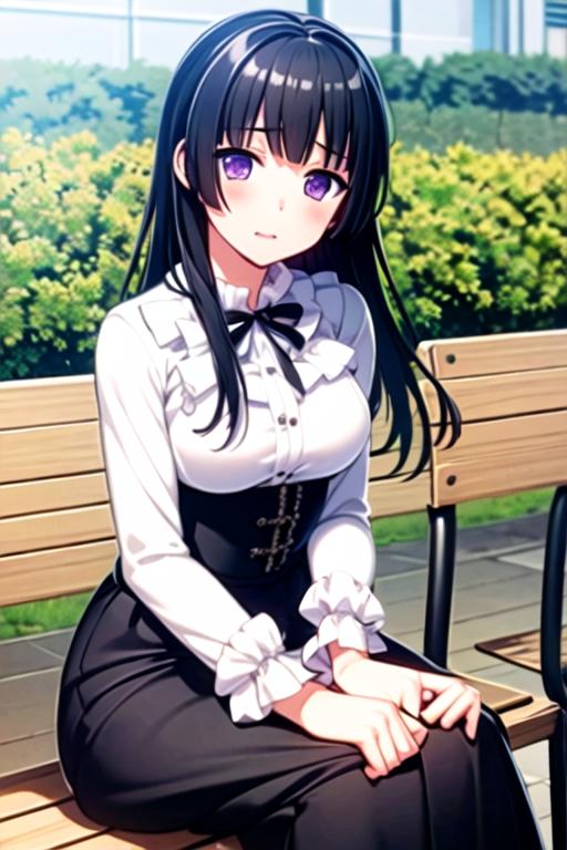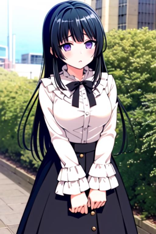 black_skirt, casual , breasts, frills, long_hair, long_sleeves, looking_at_viewer, purple_eyes,long skirt,black skirt