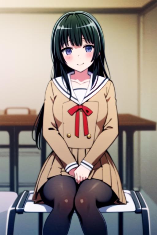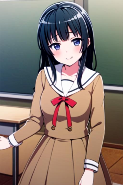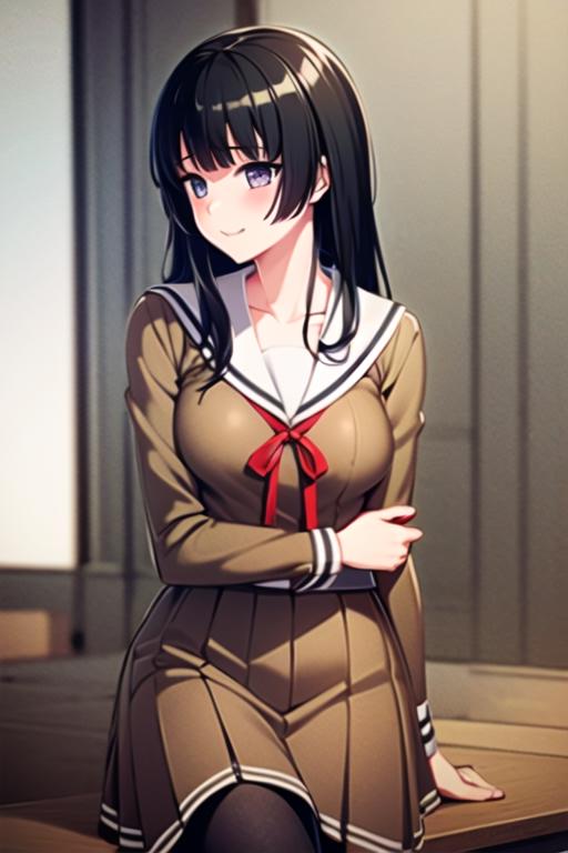 buttons,brown shirt,brown skirt, collarbone, hanasakigawa_school_uniform, facing_viewer, long_hair, long_sleeves, red_ribbon, ribbon, sailor_collar, school_uniform