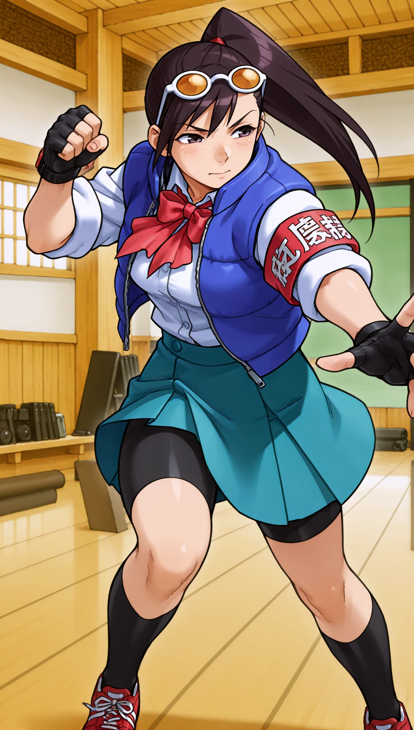 Optionnal Words: skirt, school uniform, jacket, shoes, shorts, fingerless gloves, kneehighs, bike shorts, armband, sneakers, eyewear on head, sleeves rolled up