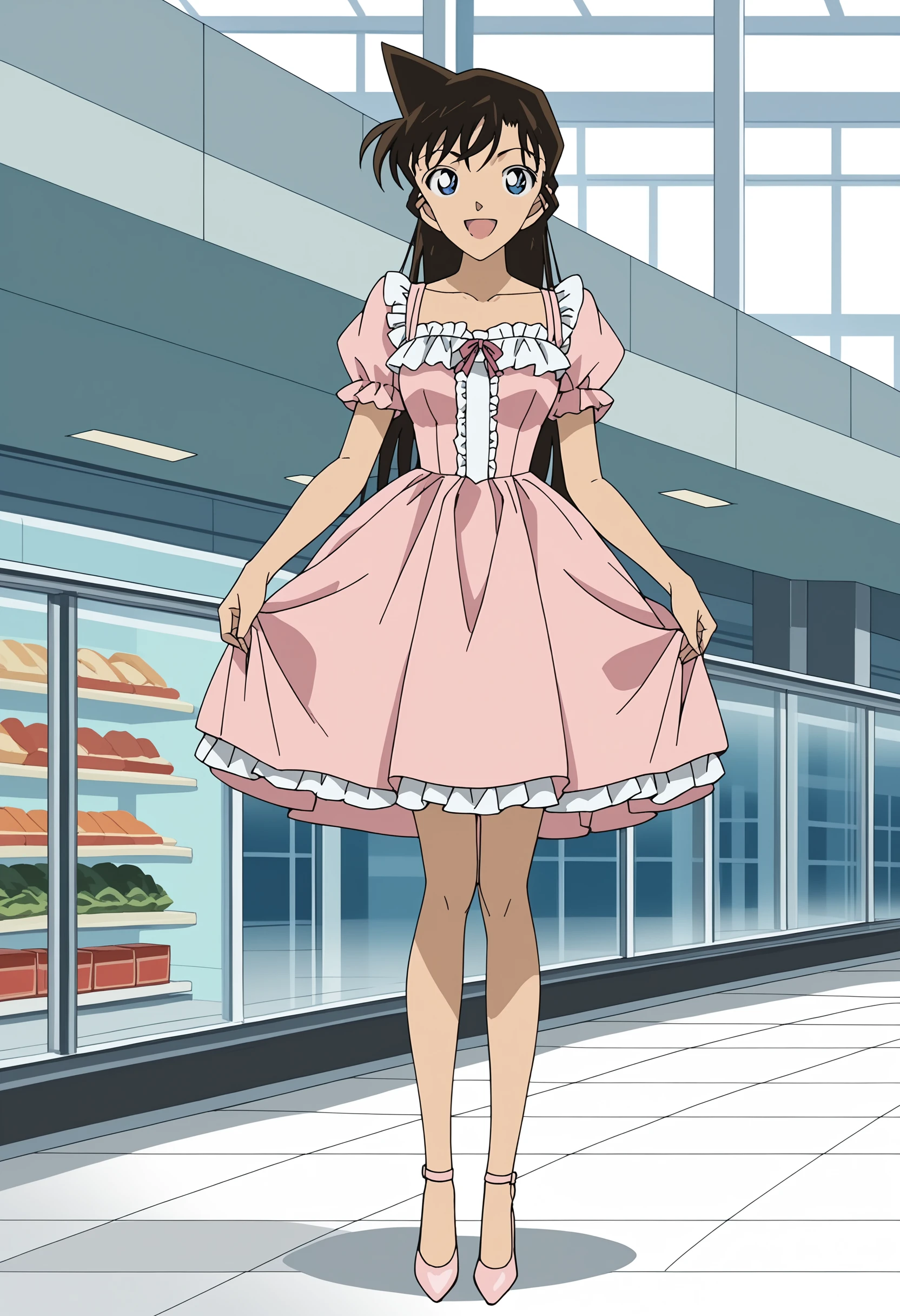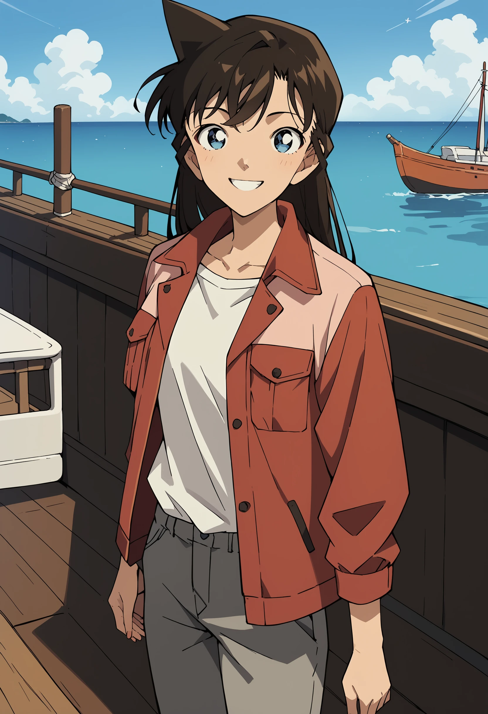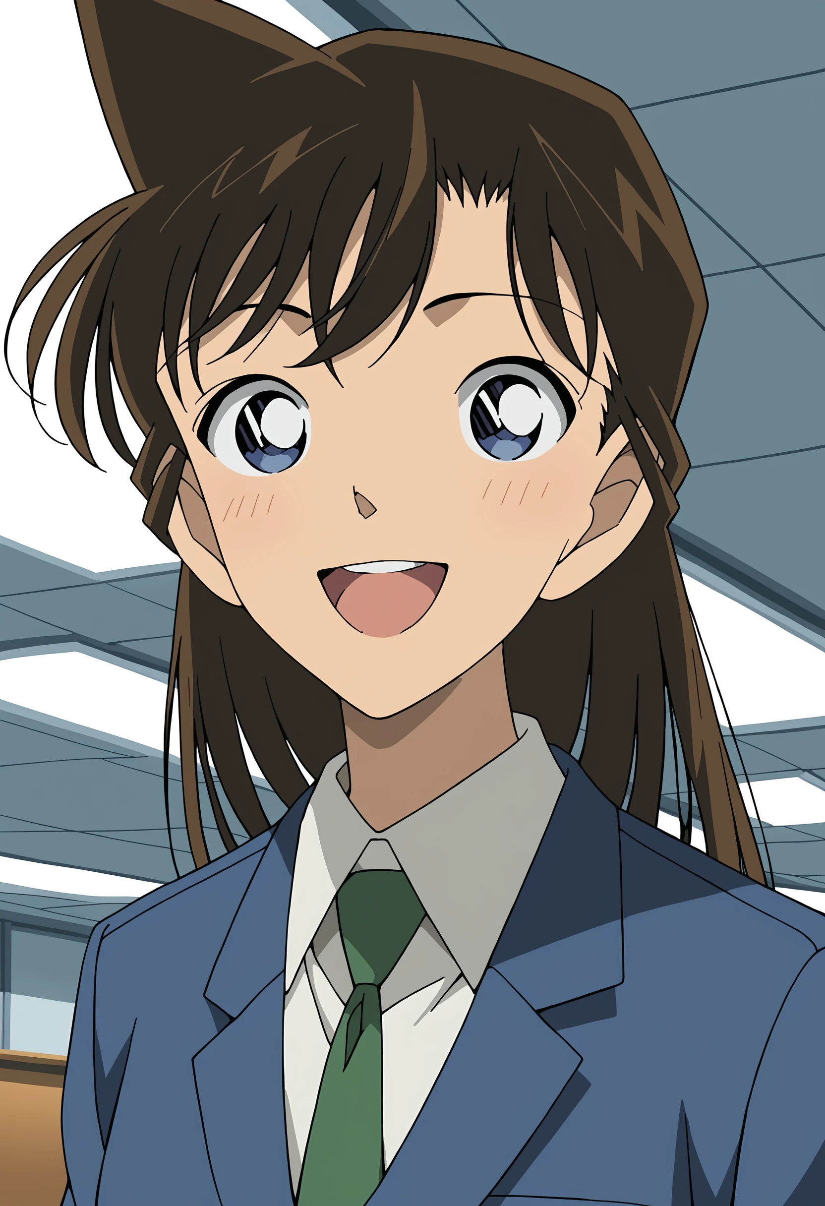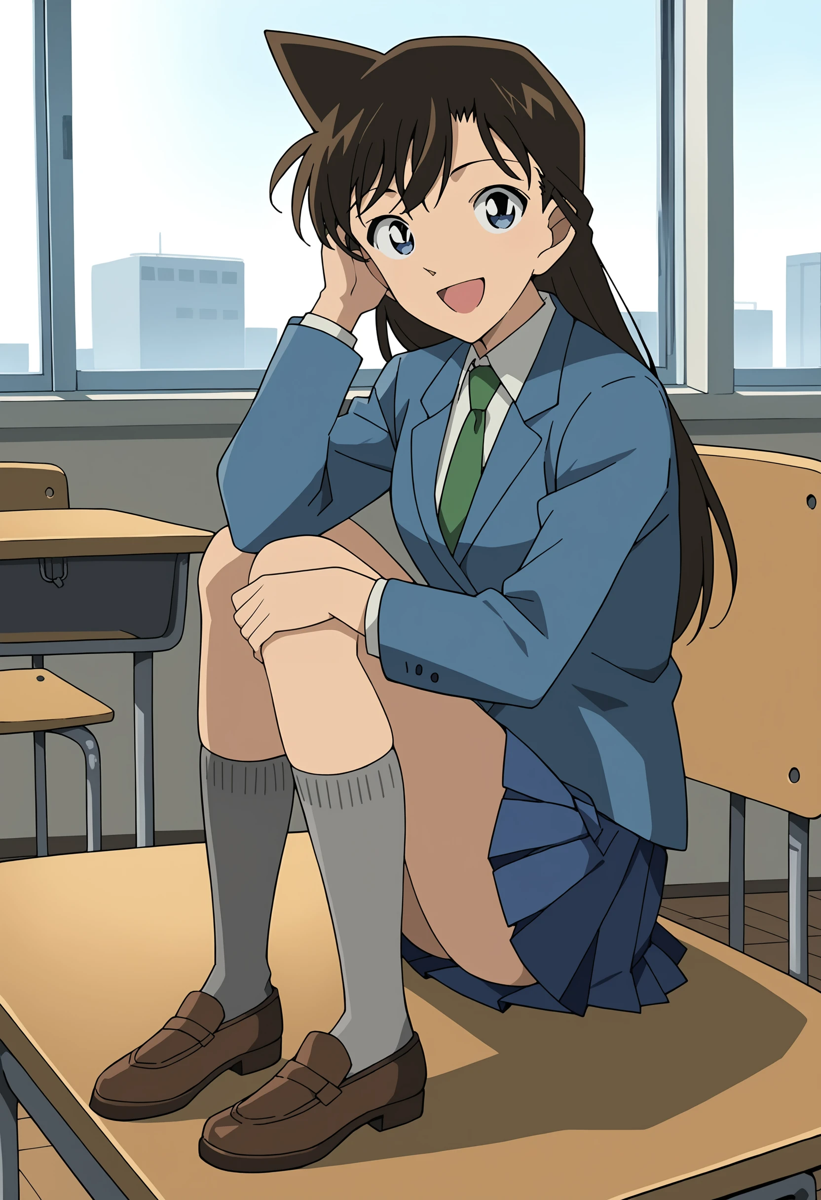 Suggested keywords for her school uniform: Blue jacket, green necktie, white collared shirt, blue pleated skirt, gray socks, brown shoes