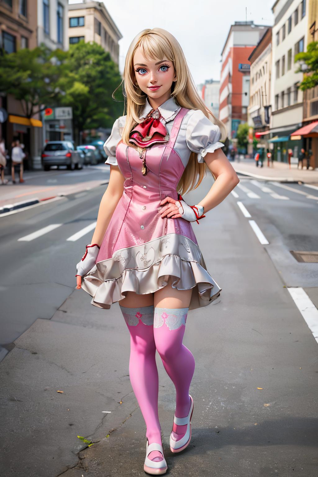 dress, skirt, fingerless gloves, puffy short sleeves, pink thighhighs, boots, or high heels, frills, white shorts,