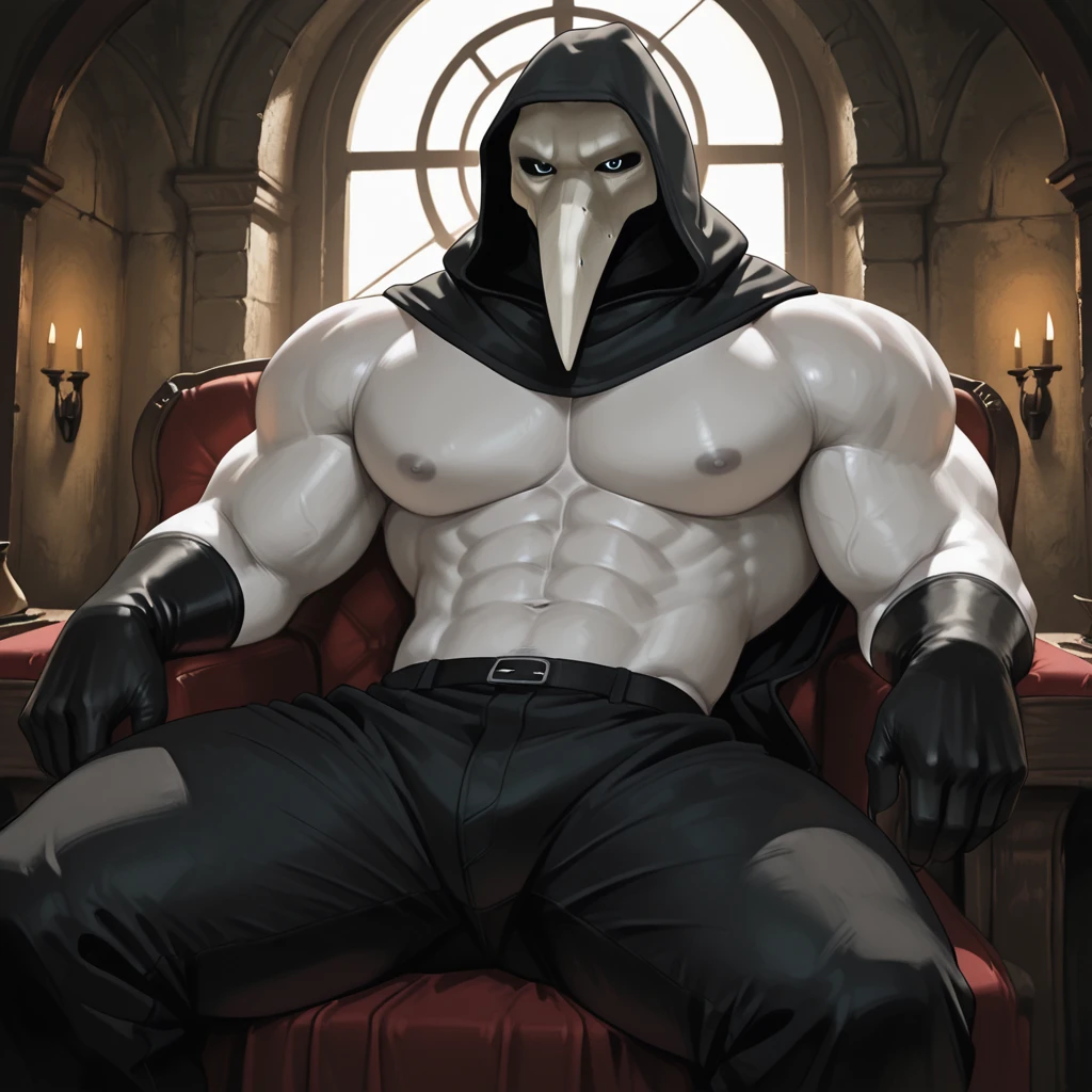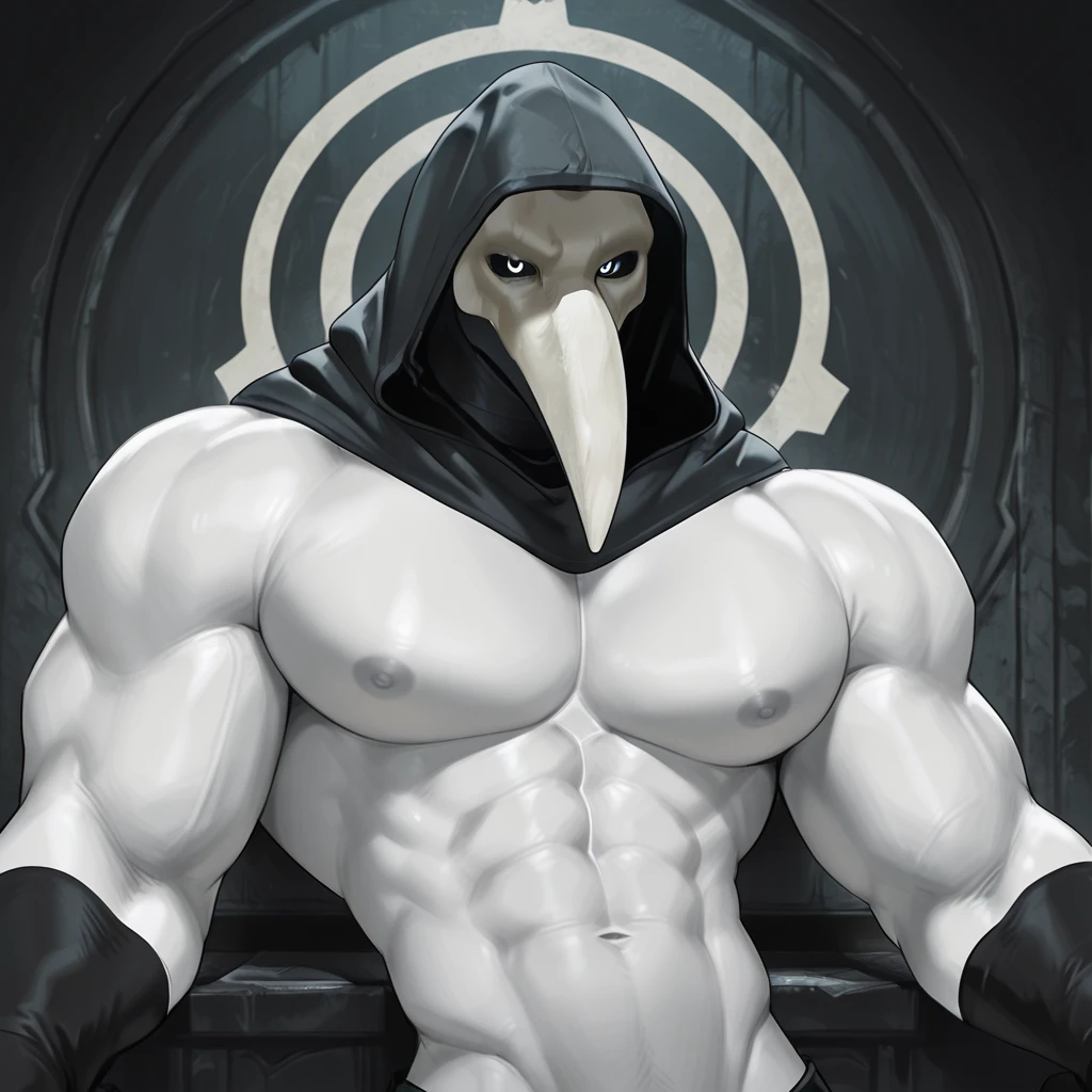scp049, plague doctor mask, black hood, shirtless, black sclera, white pupils