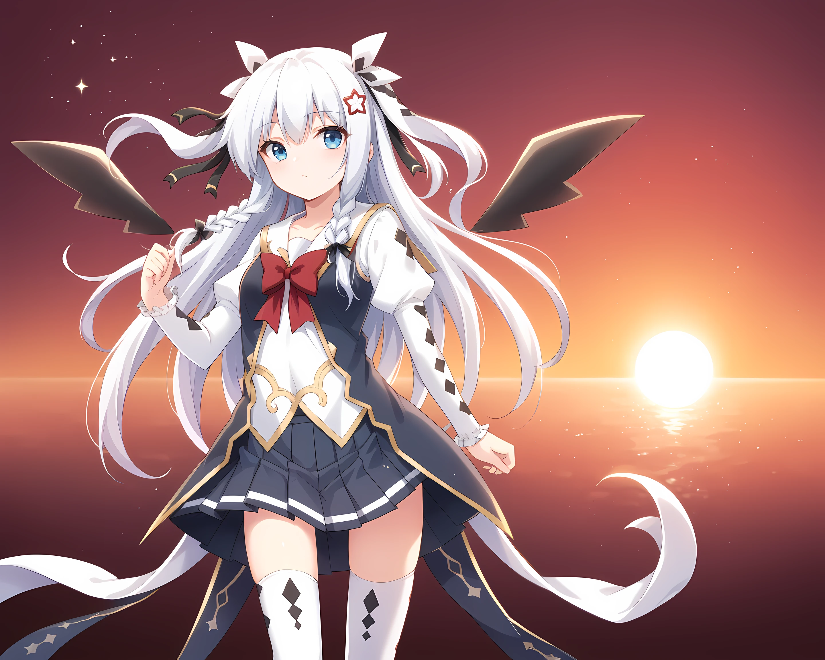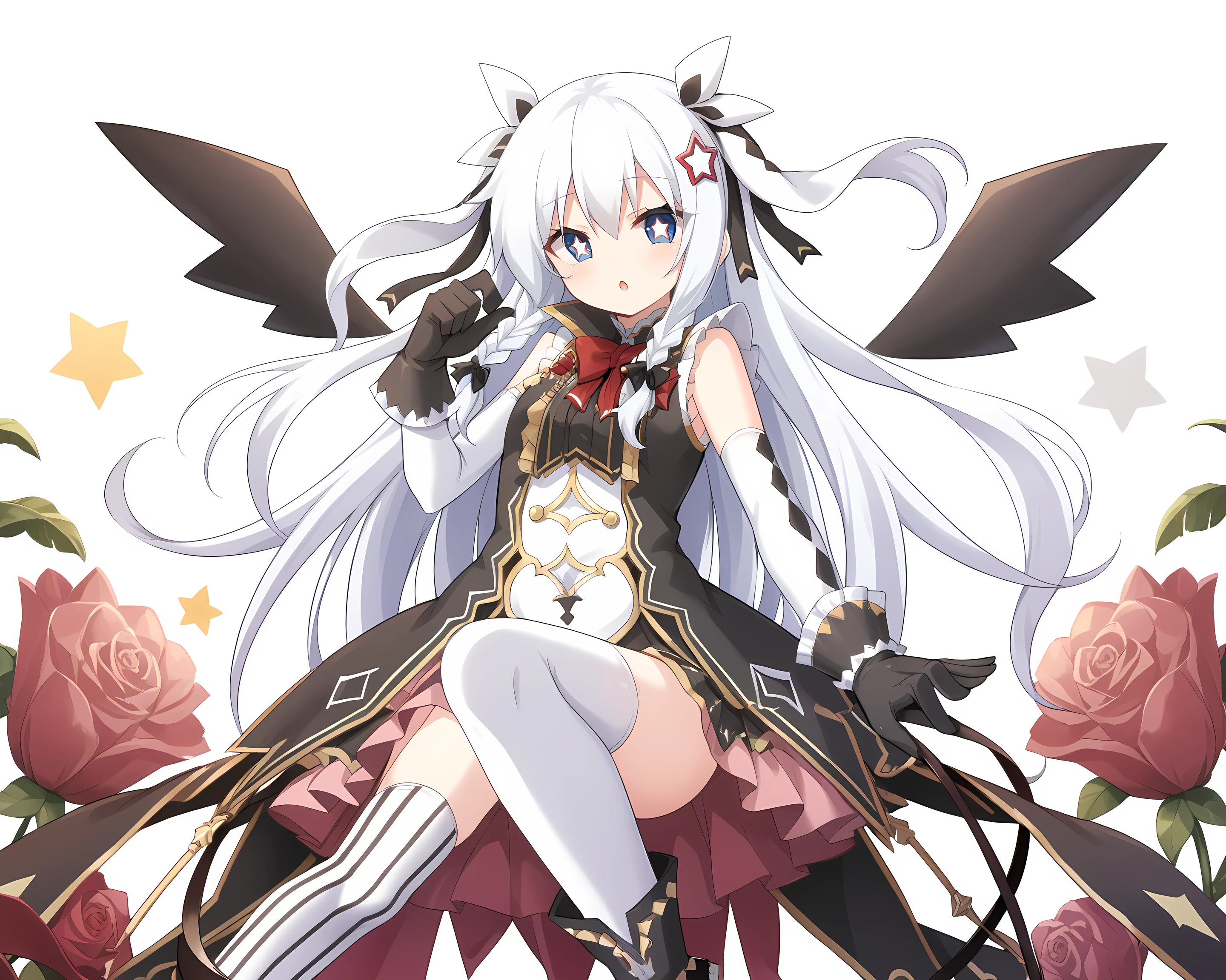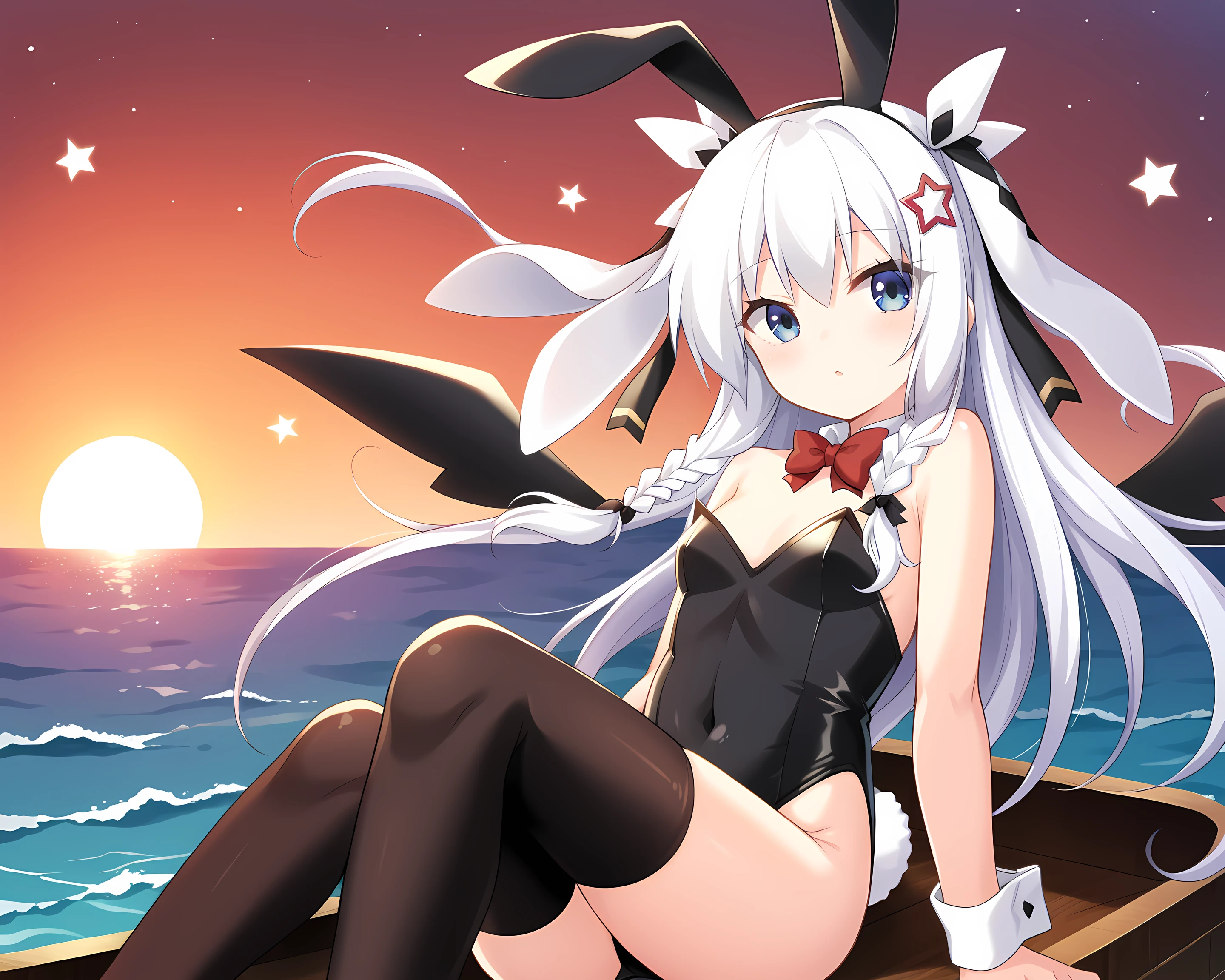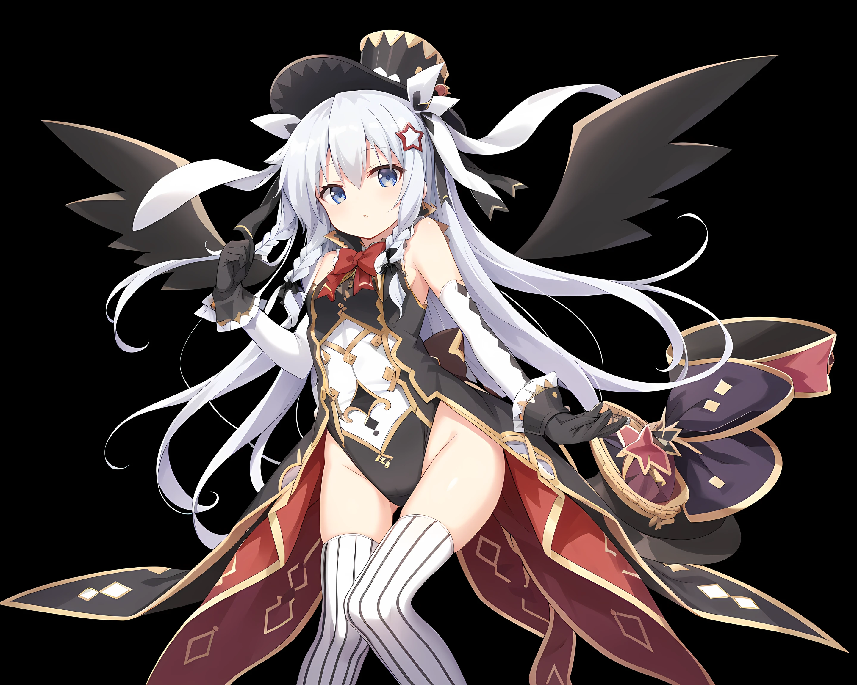 Sonya, Eushully, 1girl, solo, thighhighs, gloves, long hair, hat, braid, asymmetrical legwear, looking at viewer, star (symbol), black gloves, striped, vertical stripes, black background, elbow gloves, blue eyes, leotard, vertical-striped thighhighs, hair ornament, ribbon, simple background, striped thighhighs, wings, mismatched legwear, bow, rabbit ears, hair between eyes, top hat, hair ribbon, bare shoulders