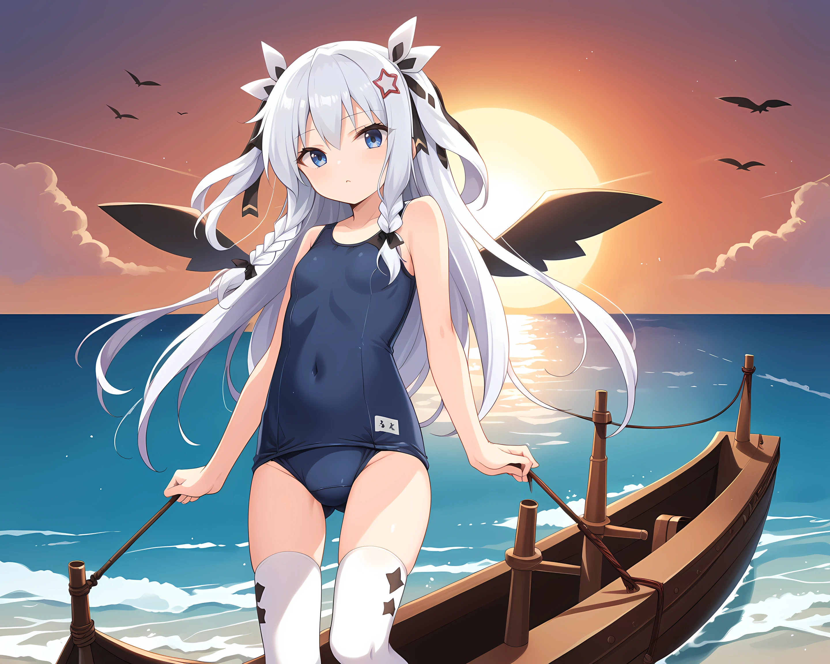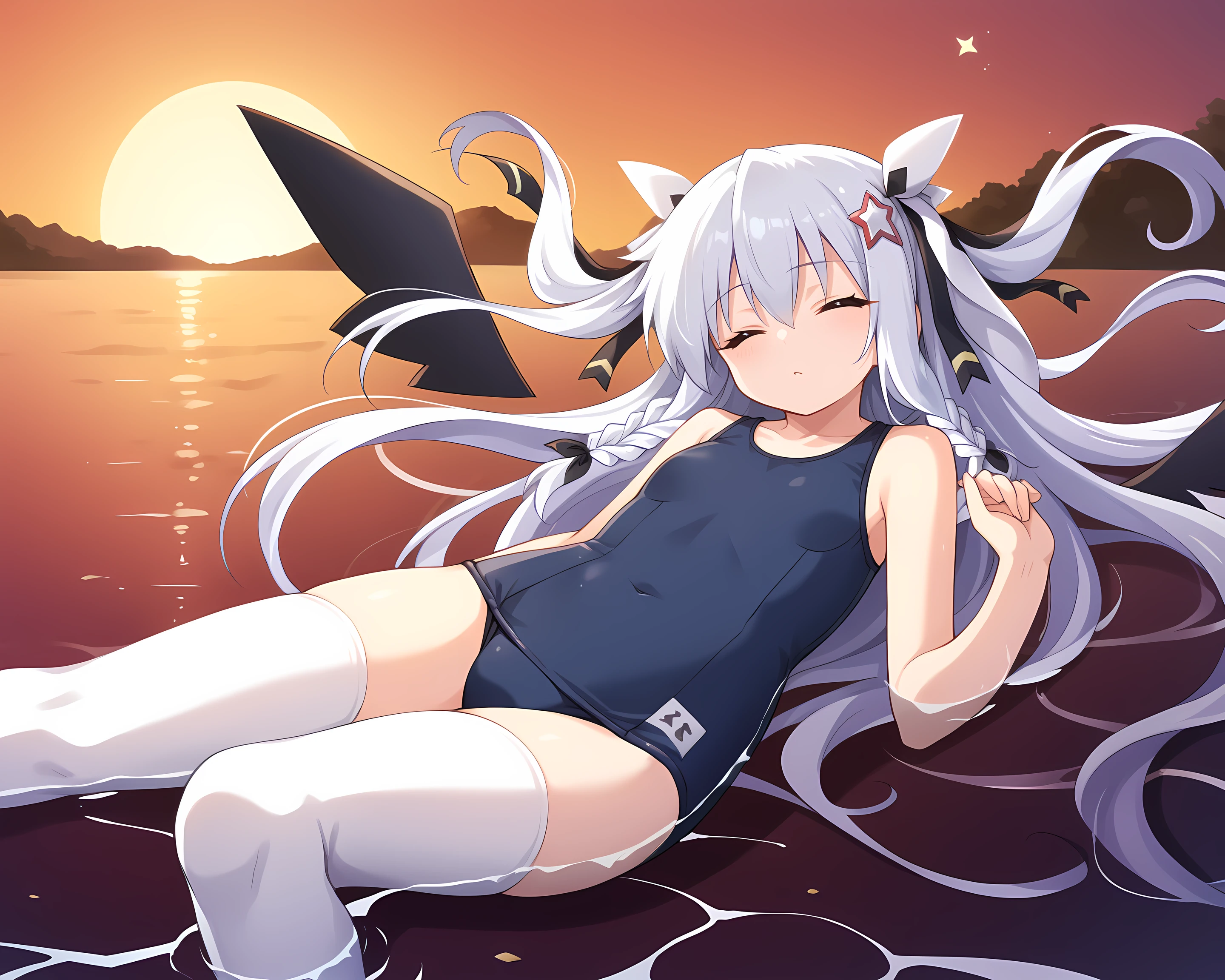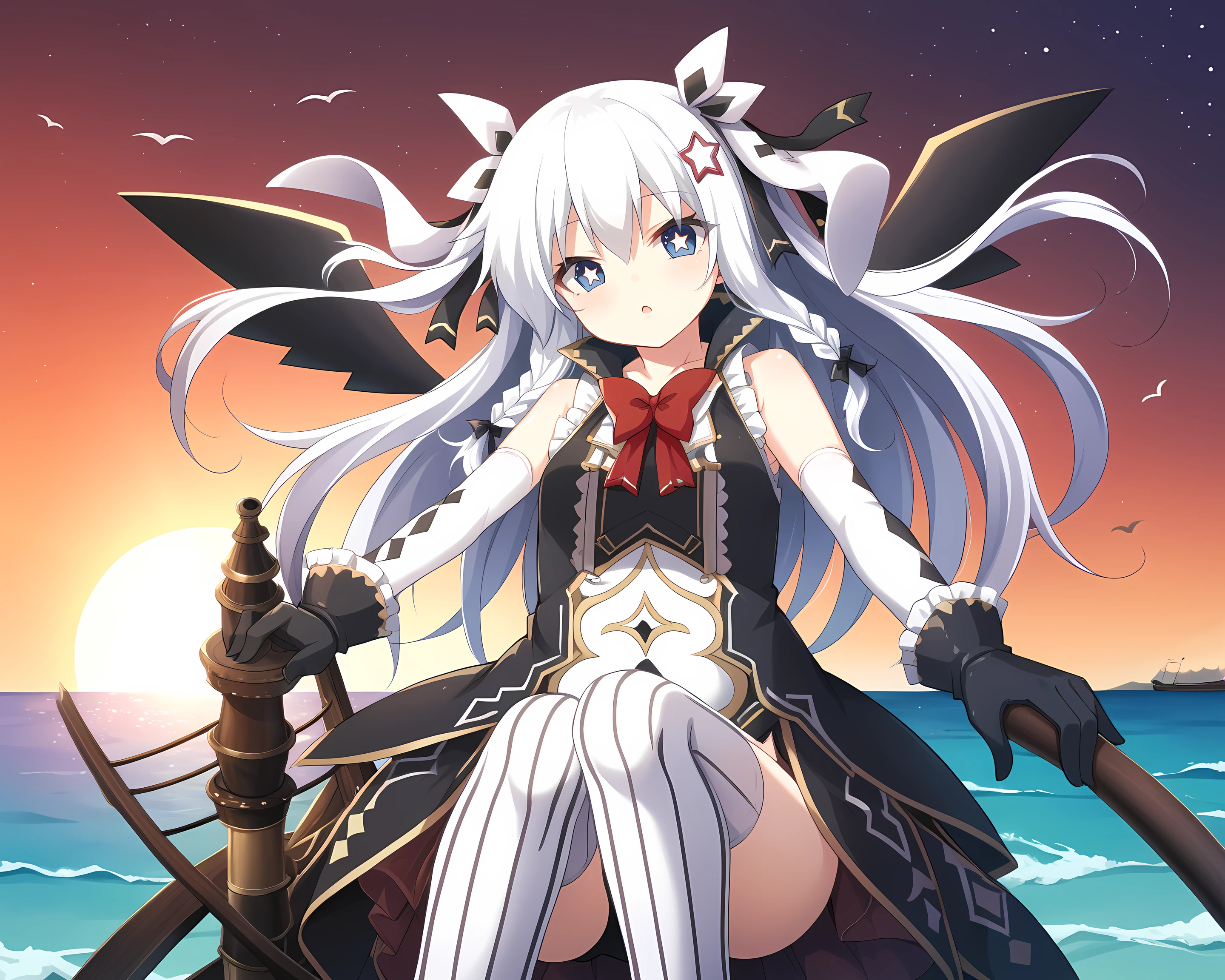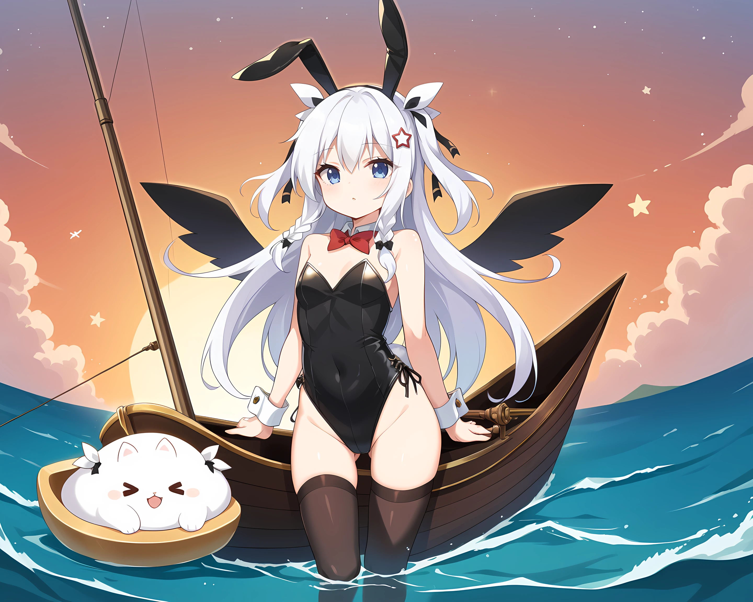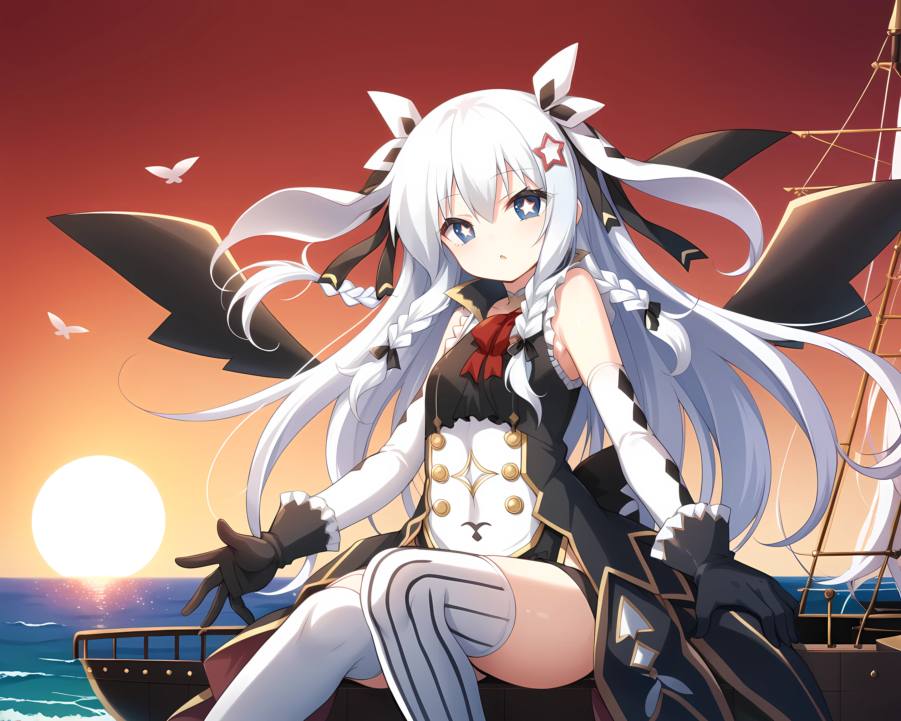 Sonya, Eushully, 1girl, solo, thighhighs, gloves, long hair, hat, braid, asymmetrical legwear, looking at viewer, star (symbol), black gloves, striped, vertical stripes, black background, elbow gloves, blue eyes, leotard, vertical-striped thighhighs, hair ornament, ribbon, simple background, striped thighhighs, wings, mismatched legwear, bow, rabbit ears, hair between eyes, top hat, hair ribbon, bare shoulders