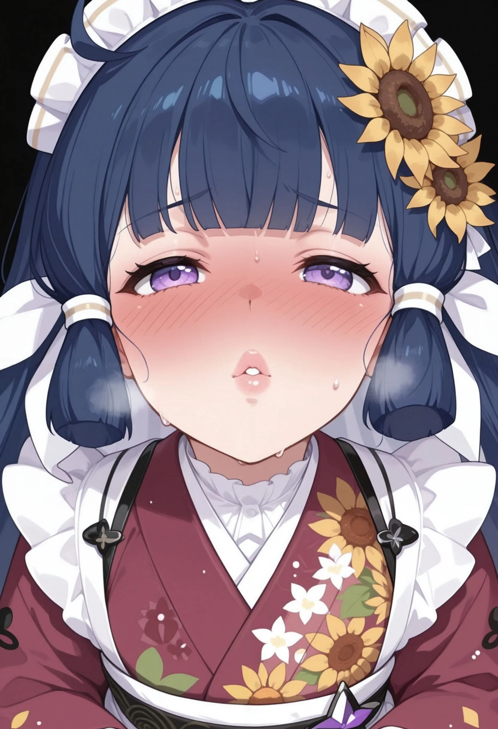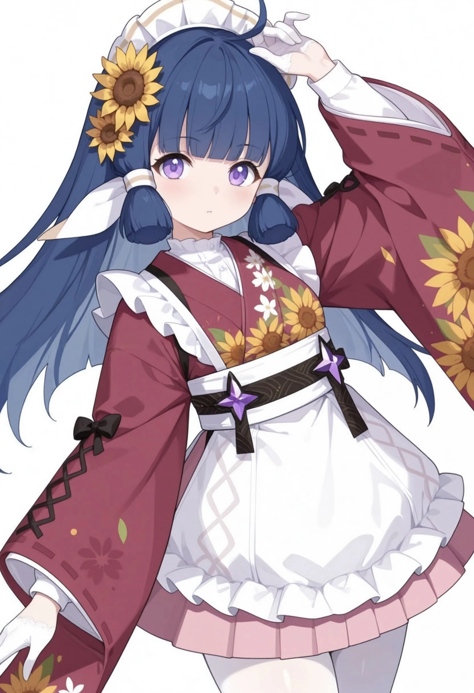 nanoha_\(stella_sora\), stllsrnnh, ahoge, apron, blue hair, blunt bangs, collared shirt, floral print, flower, frilled apron, frills, hair flower, hair ornament, japanese clothes, kimono, long hair, long sleeves, maid, maid headdress, mary janes, miniskirt, pantyhose, pink skirt, puffy long sleeves, puffy sleeves, purple eyes, red kimono, shirt, sidelocks, skirt, sunflower, sunflower hair ornament, sunflower print, wa maid, waist apron, white apron, white pantyhose, white shirt, wide sleeves, <lora:stella_sora_nanoha_illustrious:0.8>Without Clothes