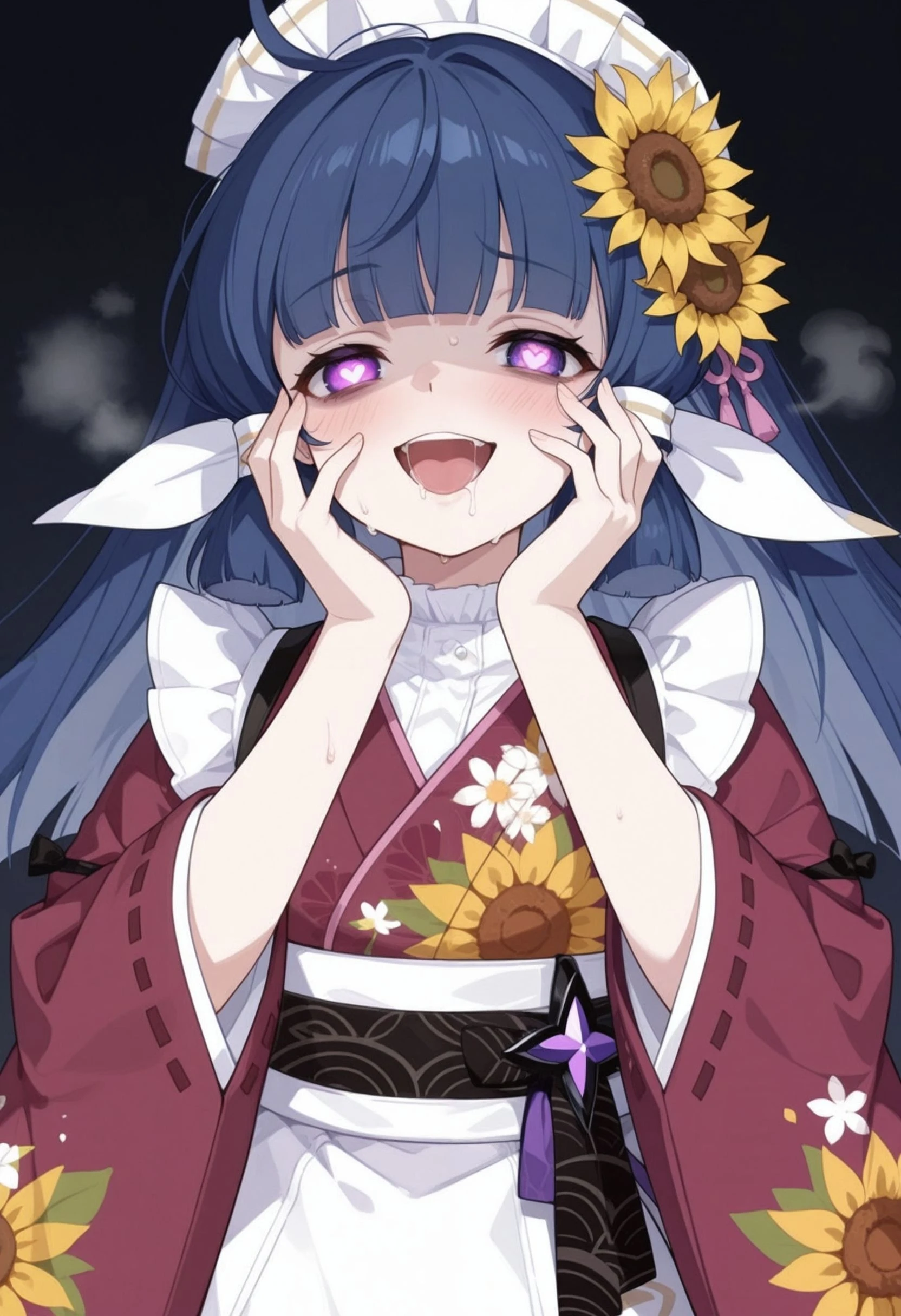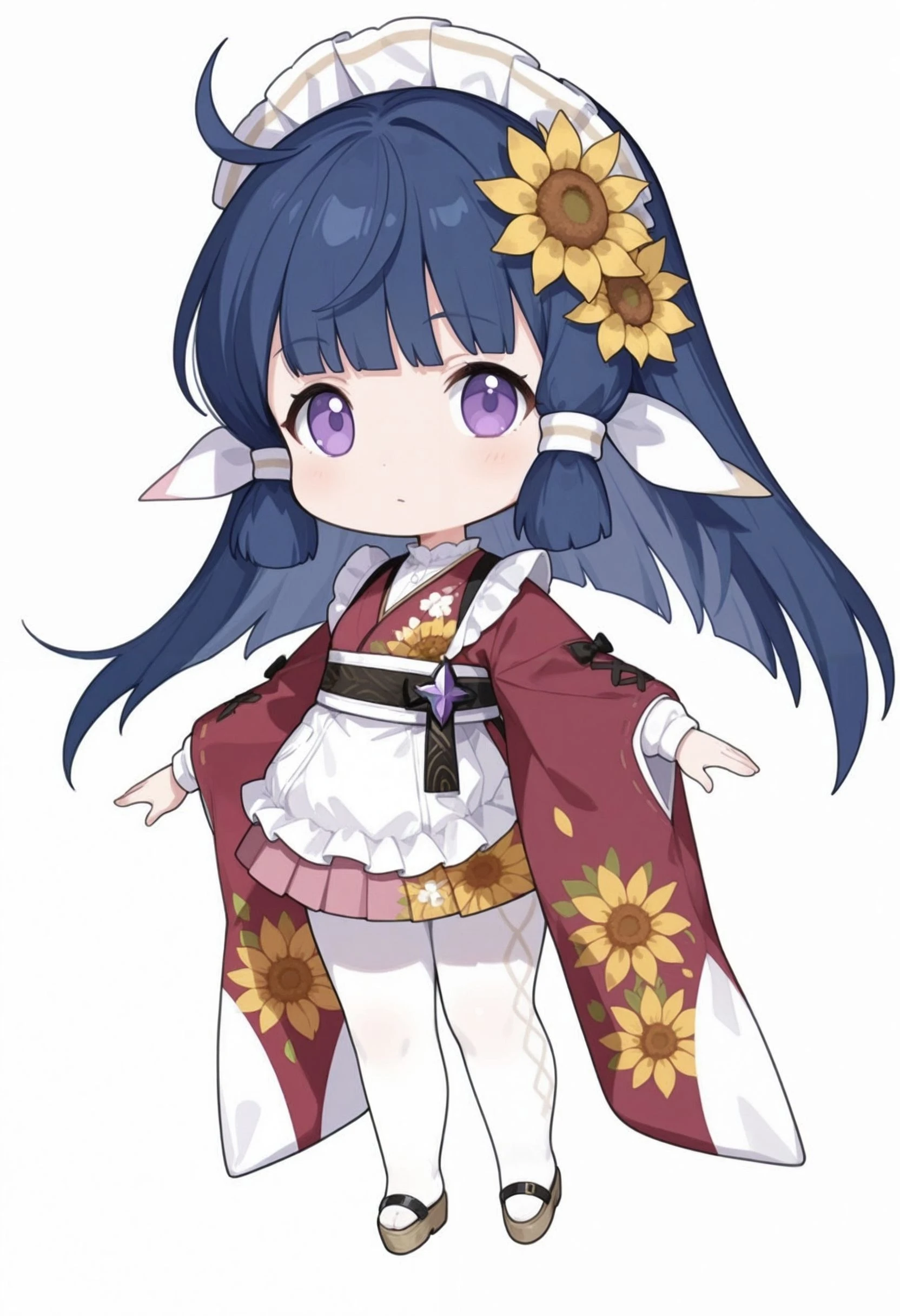 nanoha_\(stella_sora\), stllsrnnh, ahoge, apron, blue hair, blunt bangs, collared shirt, floral print, flower, frilled apron, frills, hair flower, hair ornament, japanese clothes, kimono, long hair, long sleeves, maid, maid headdress, mary janes, miniskirt, pantyhose, pink skirt, puffy long sleeves, puffy sleeves, purple eyes, red kimono, shirt, sidelocks, skirt, sunflower, sunflower hair ornament, sunflower print, wa maid, waist apron, white apron, white pantyhose, white shirt, wide sleeves, <lora:stella_sora_nanoha_illustrious:0.8>