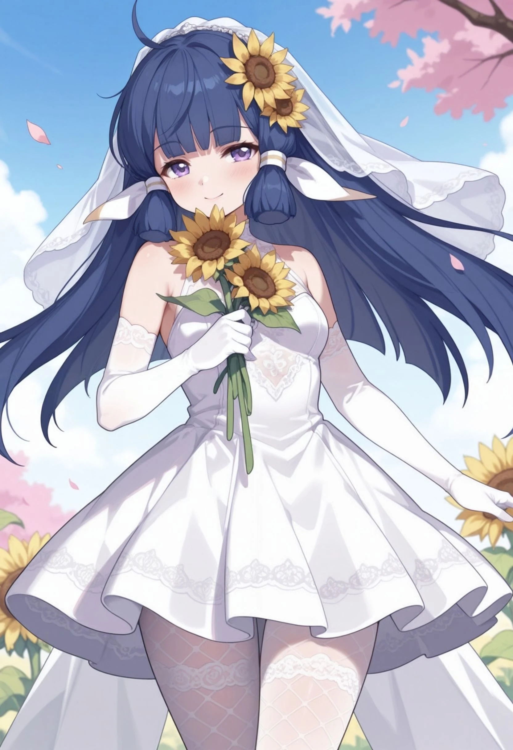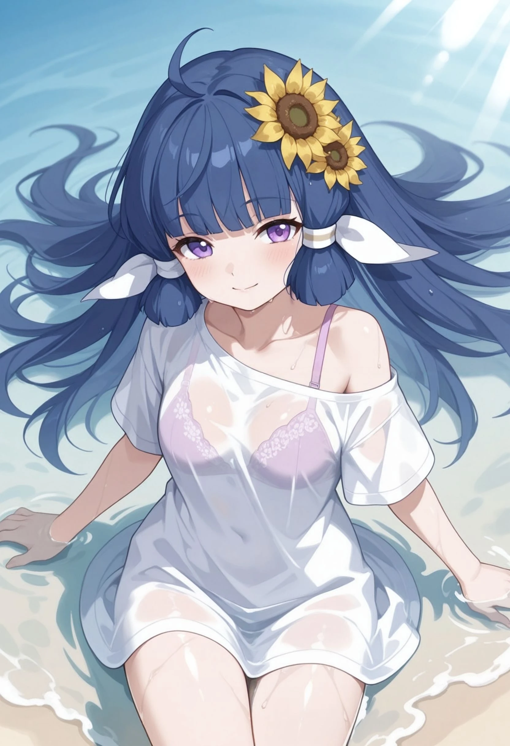 nanoha_\(stella_sora\), stllsrnnh, ahoge, blue hair, blunt bangs, hair flower, hair ornament, long hair, purple eyes, sidelocks, sunflower, sunflower hair ornament, <lora:stella_sora_nanoha_illustrious:0.8>Description