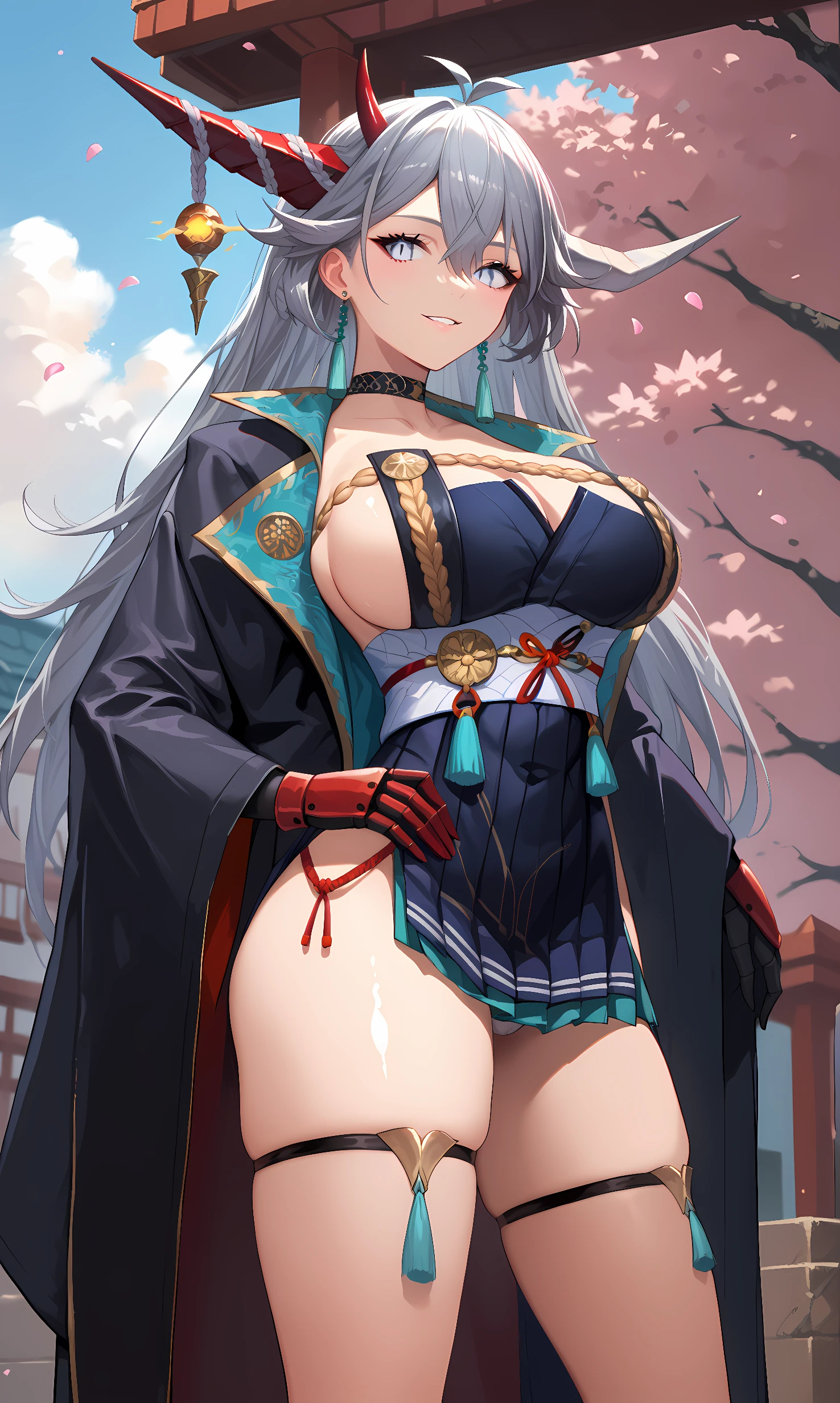 choker, japanese clothes, pleated dress, skindentation, jewelry, black gloves, coat, thigh strap, cleavage, short dress, white sash, black skirt, wide sleeves, sideless outfit, gauntlets, arm guards