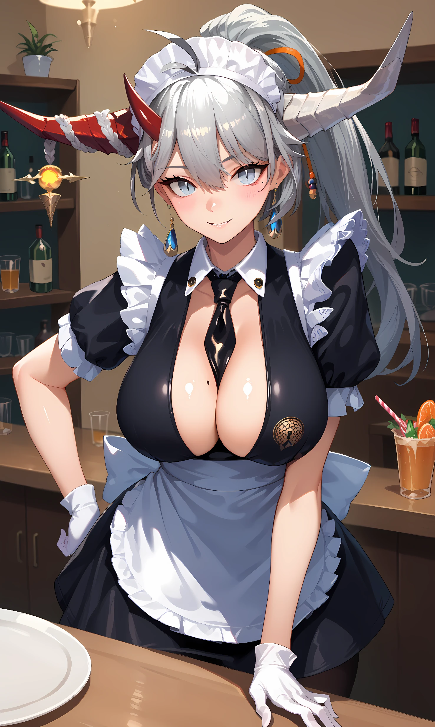 hakuryuu, grey eyes, slit pupils, horns, multiple horns, two-tone horns, asymmetrical horns, mismatched horns, (grey hair:1.3), long hair, hair ornament, ahoge, earrings, center opening, necktie between breasts, black necktie, jewelry, maid headdress, black dress, white apron, puffy short sleeves, white gloves, mole on breast, black pantyhose, cleavage, high ponytail