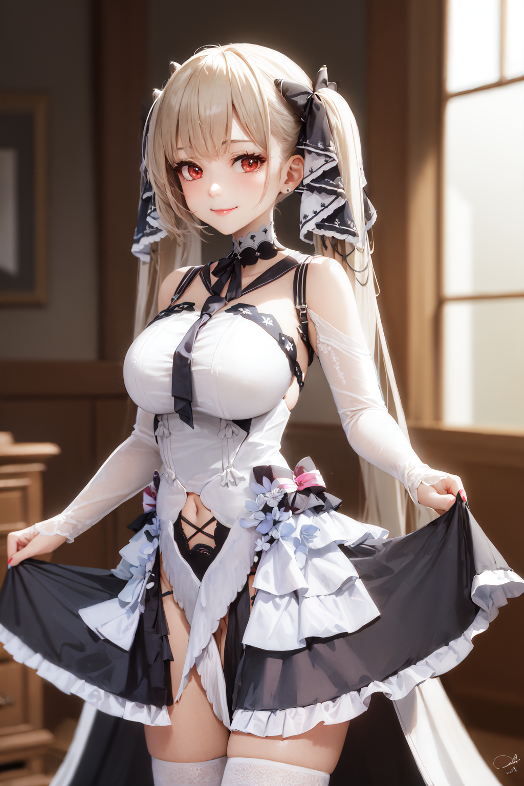 Default Outfit: frilled dress, white thighhighs, cleavage