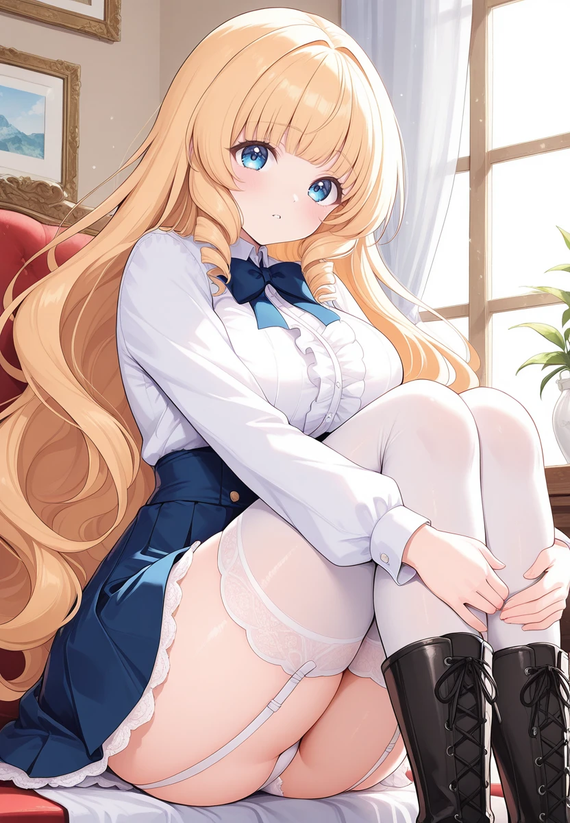 starf, 1girl, blue eyes, blonde hair, long hair, blunt bangs, wavy hair, skirt, thighhighs, bikini, garter straps, garter belt, long skirt, frills, school uniform,