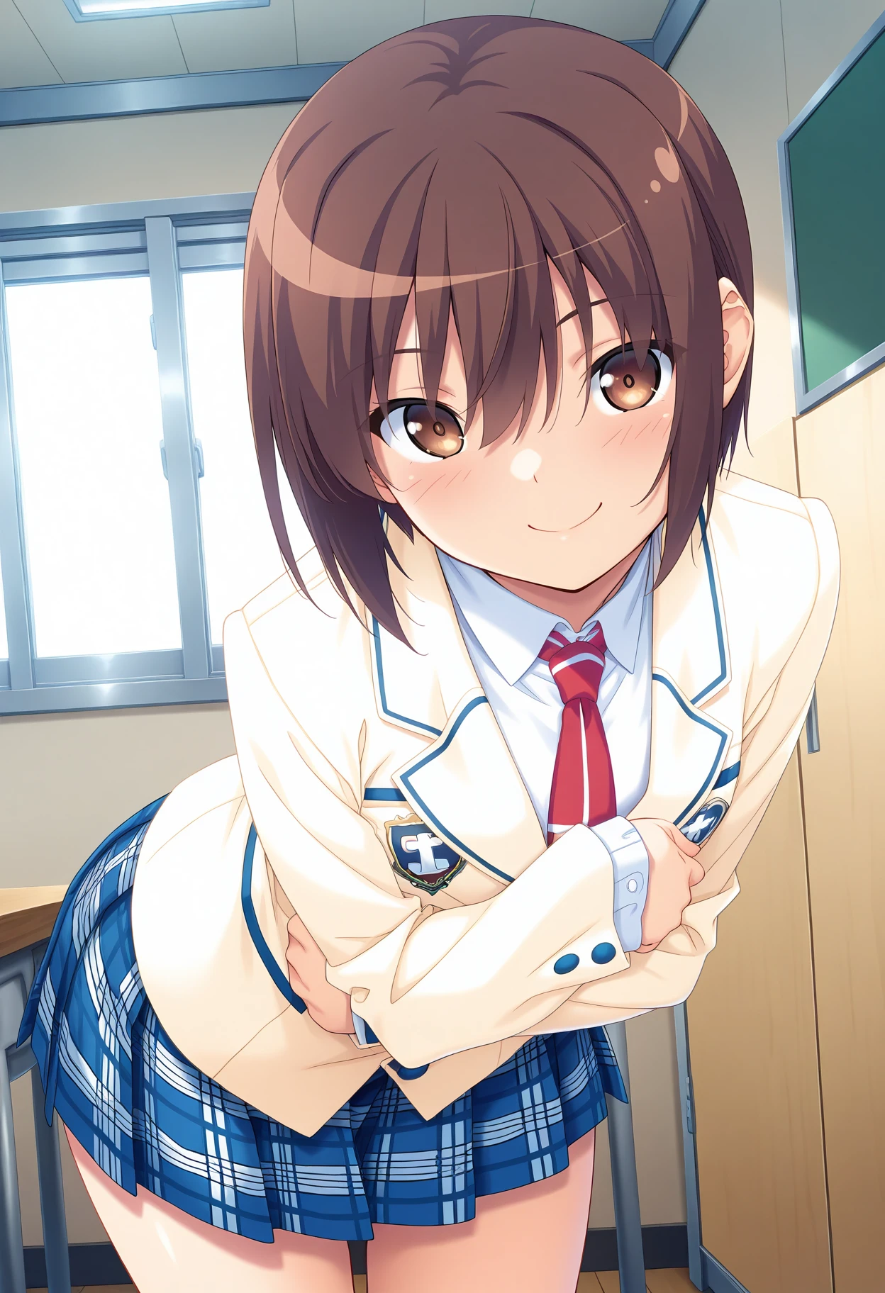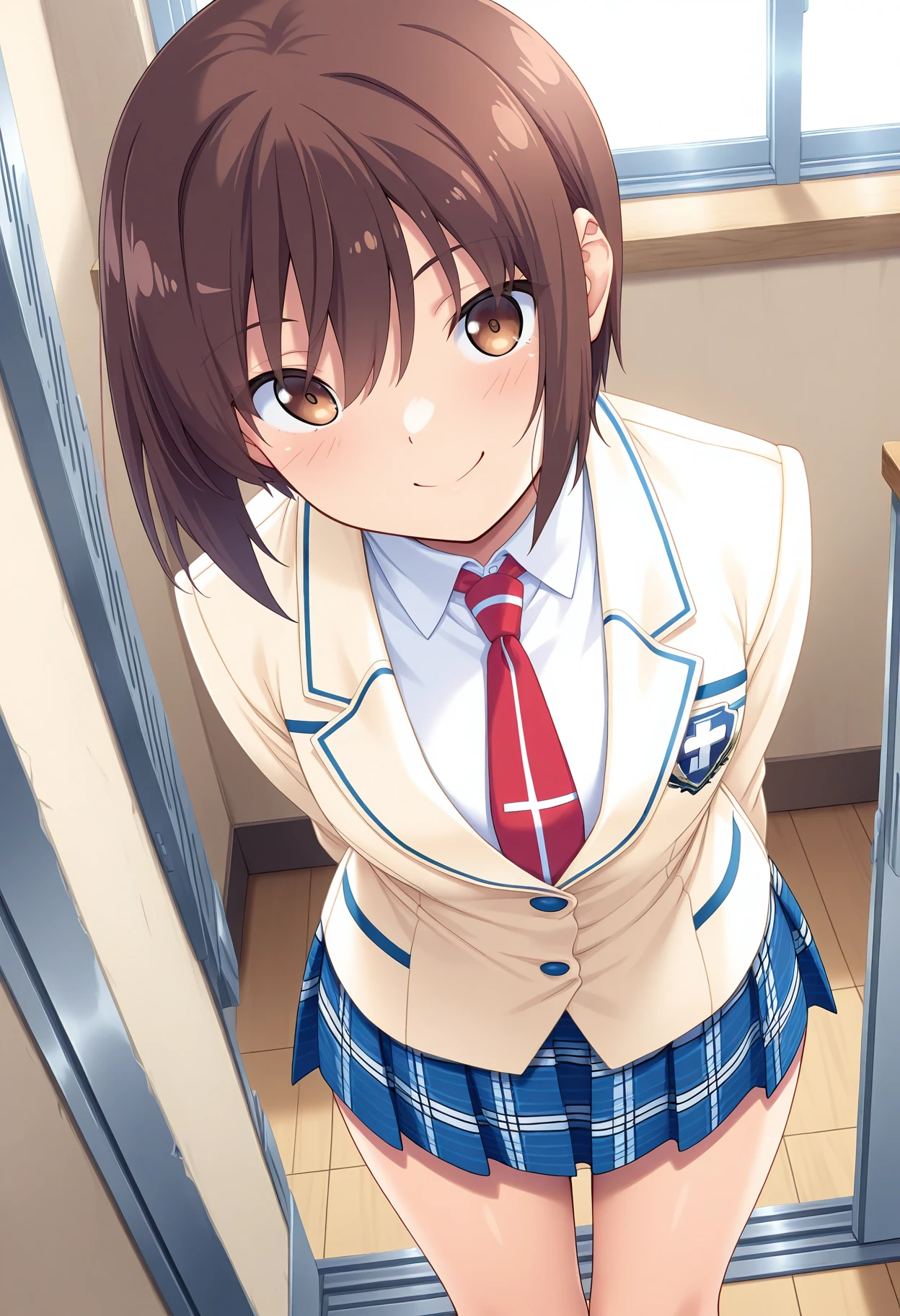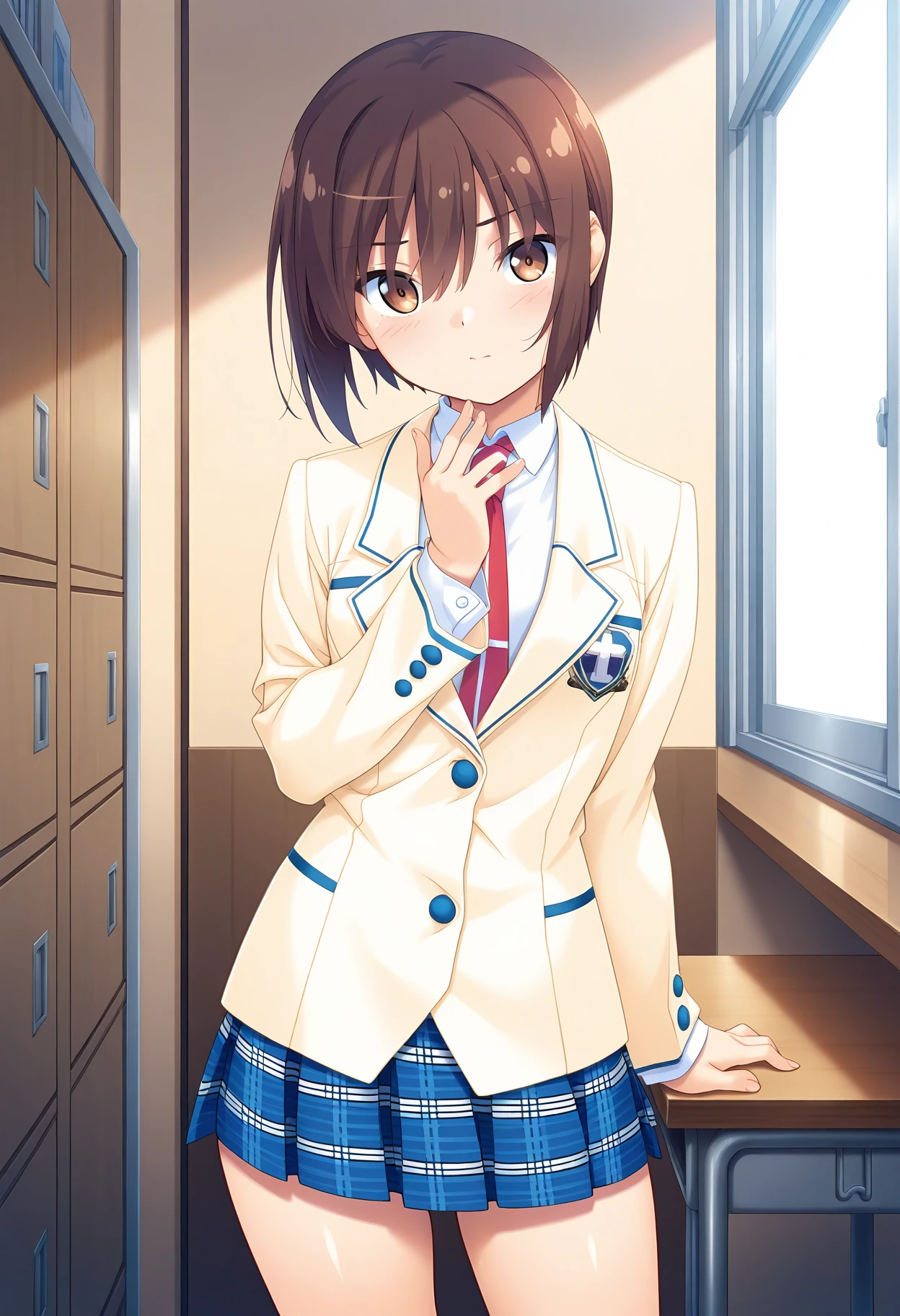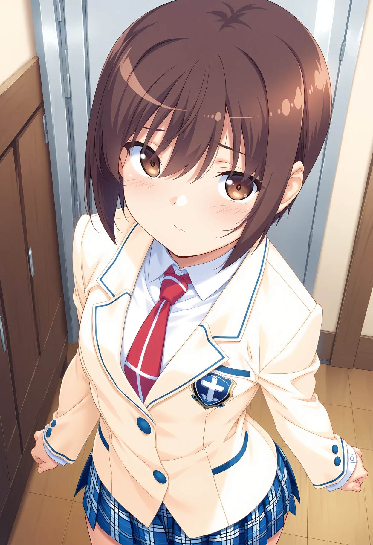 Clothing 2: beige blazer, white collared shirt, red necktie, long sleeves, blue plaid skirt,