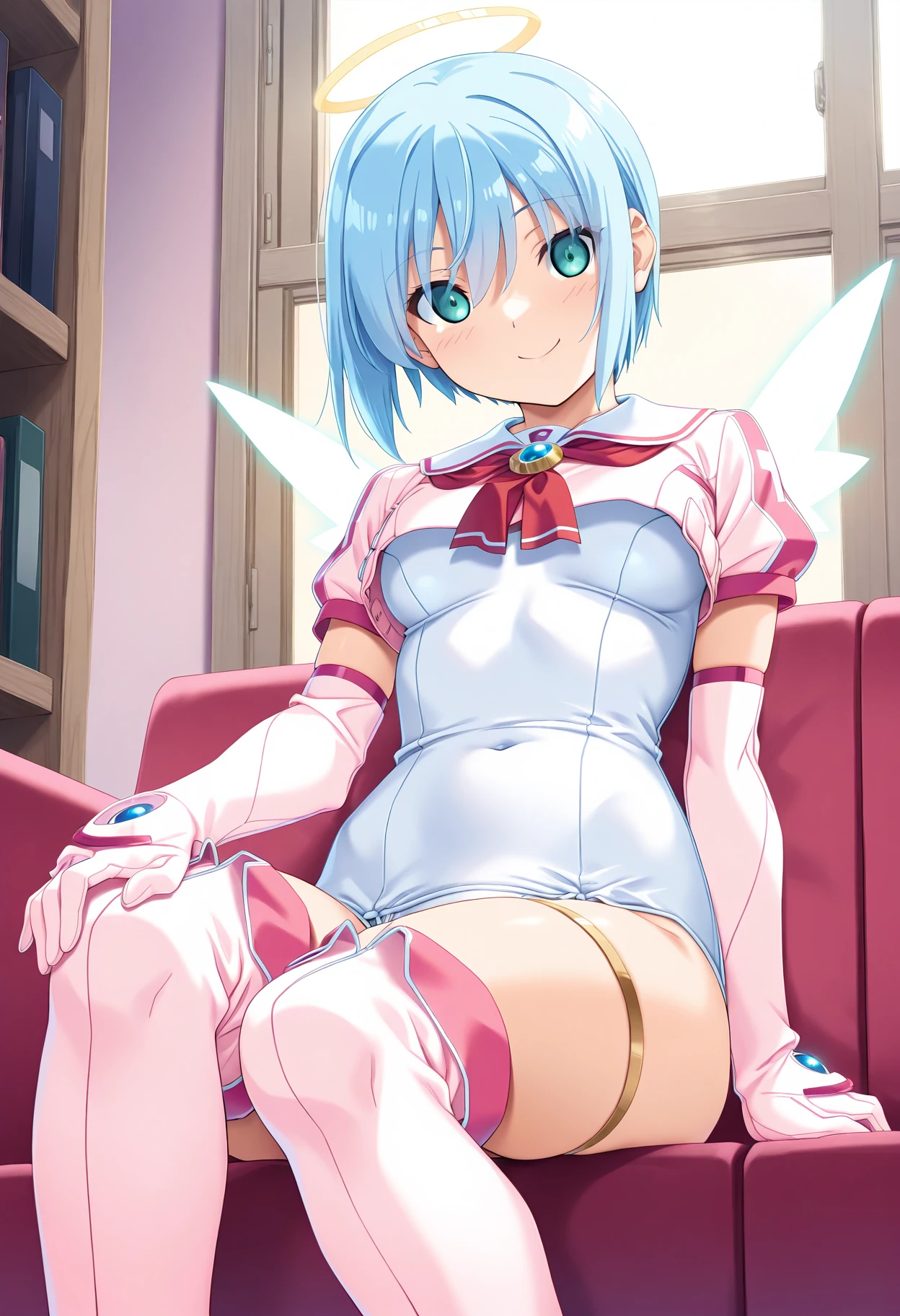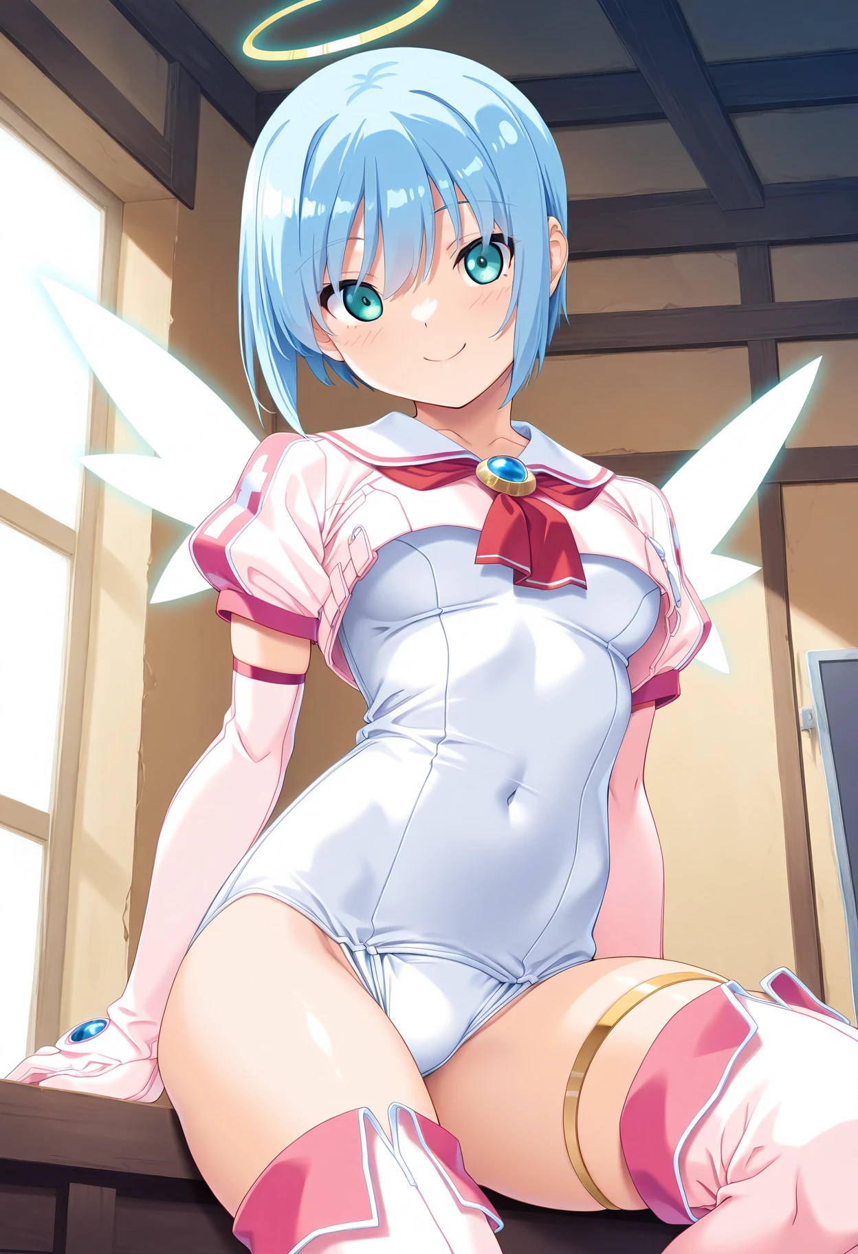 Clothing 1: pink capelet, short sleeves, pink sailor collar, red ascot, blue brooch, elbow gloves, white one-piece swimsuit, thigh boots, thighlet,