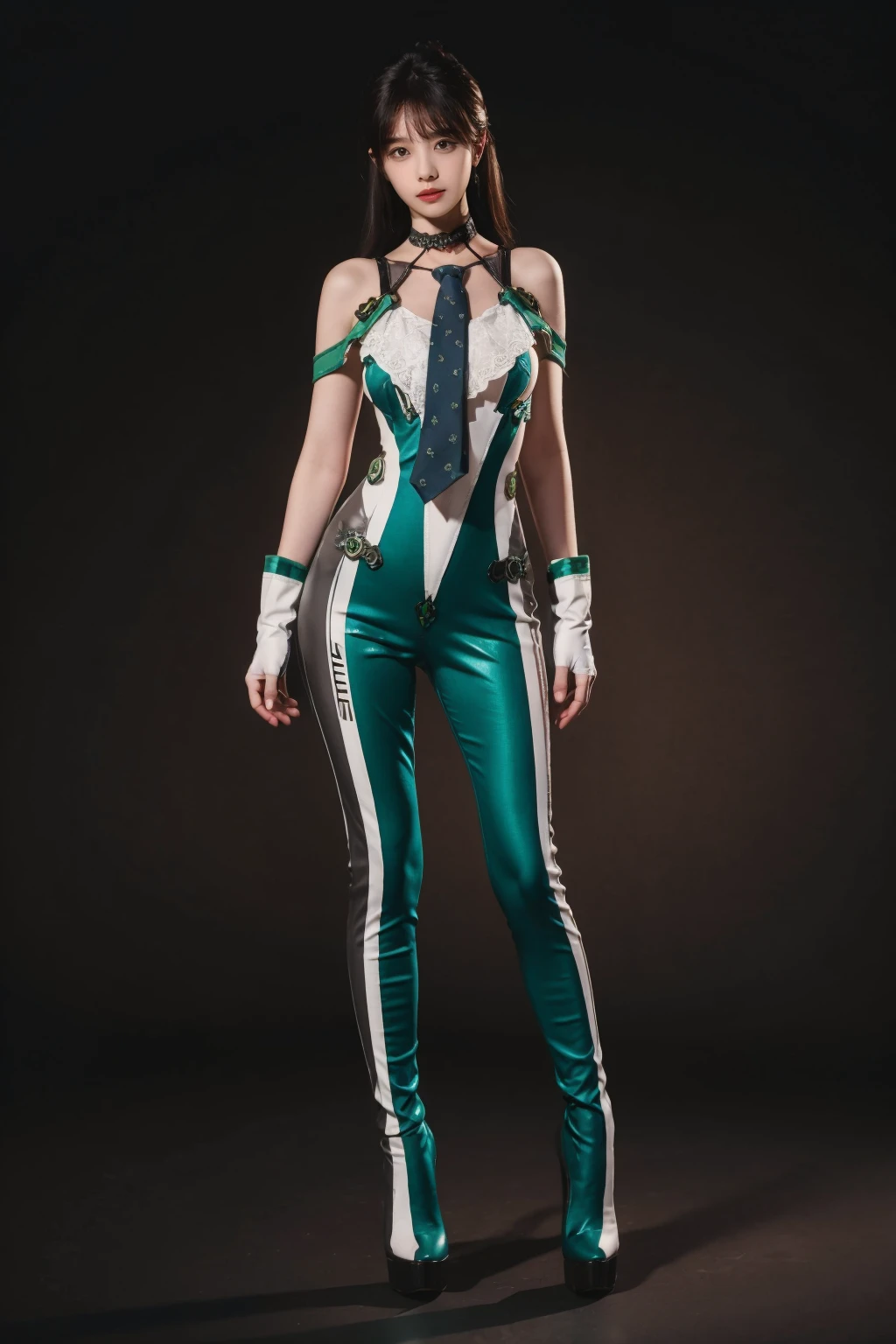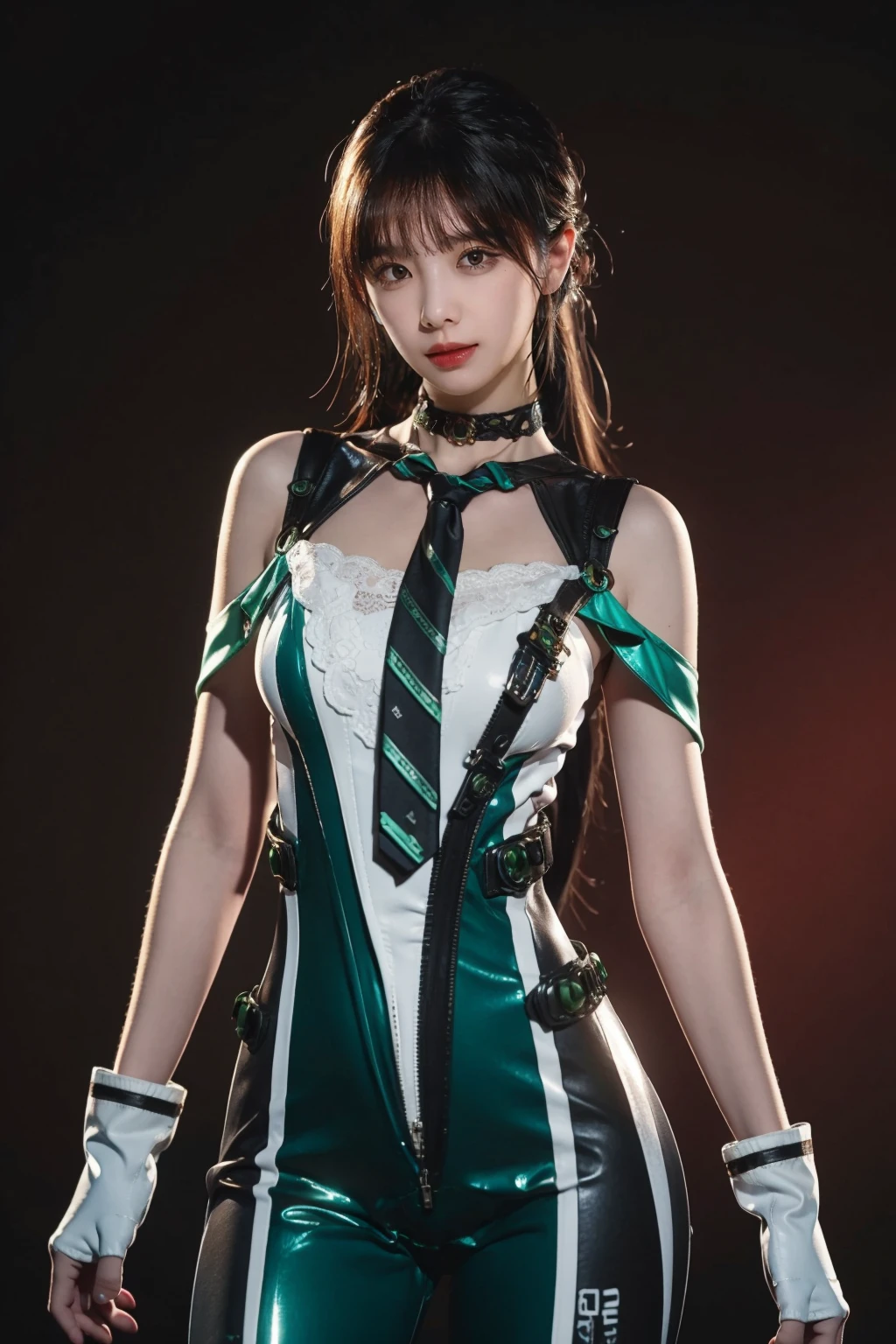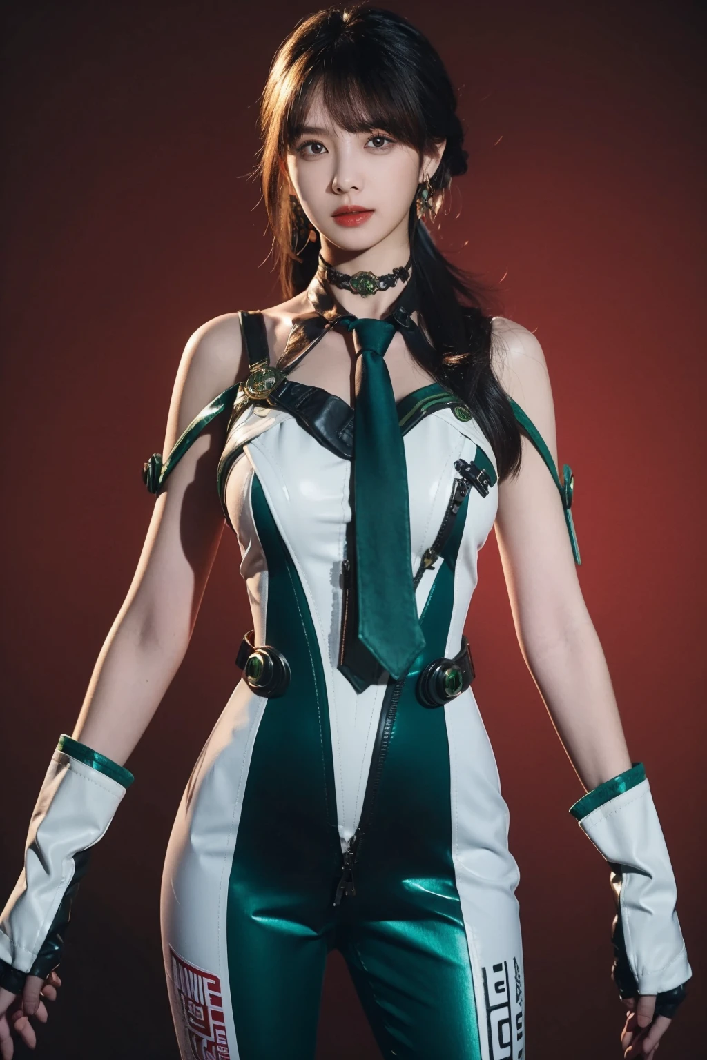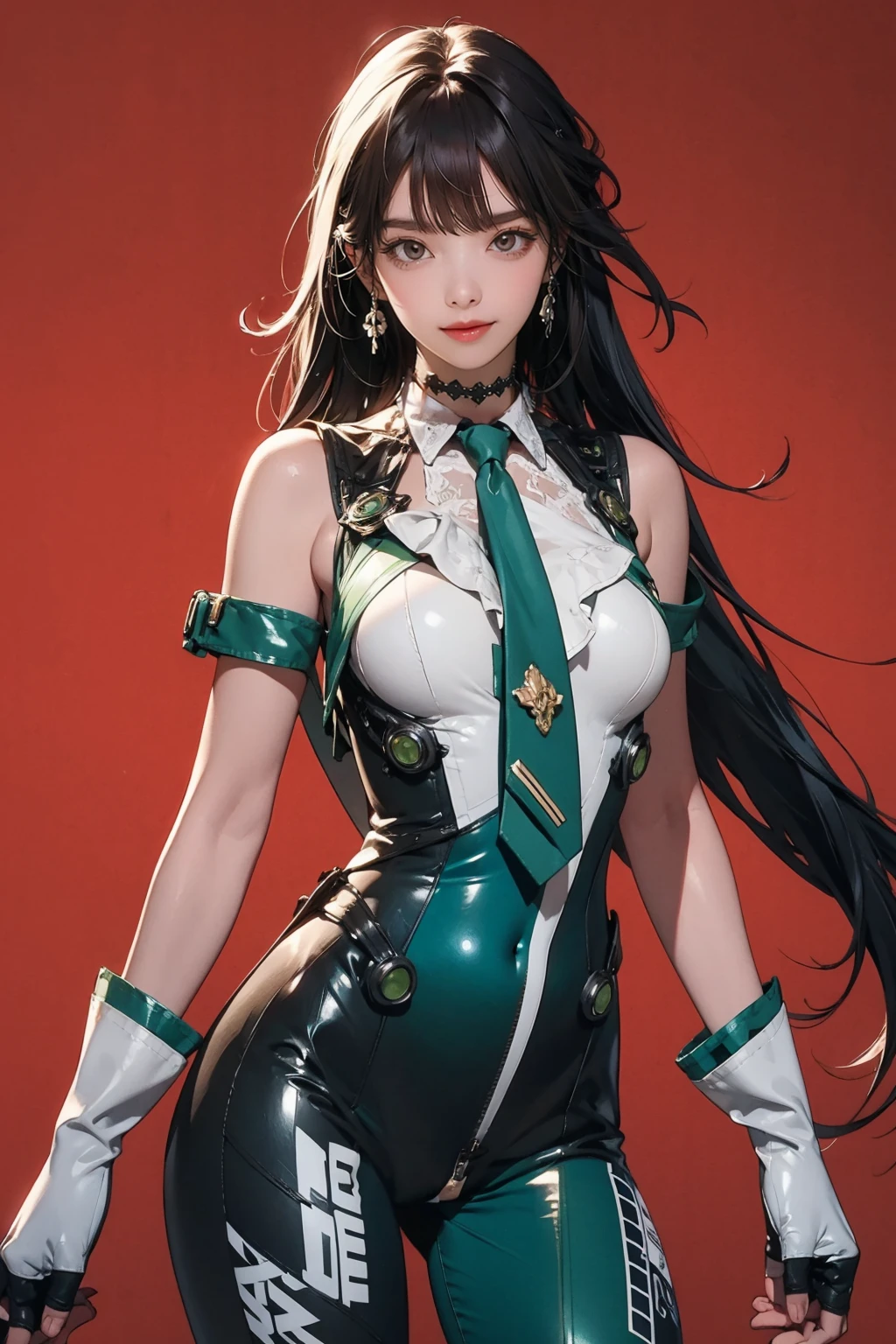 green bodysuit,green necktie,choker,see-through,fingerless gloves,clothes writing,mechanical parts,white gloves