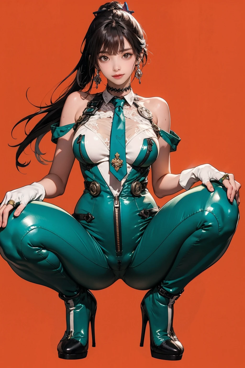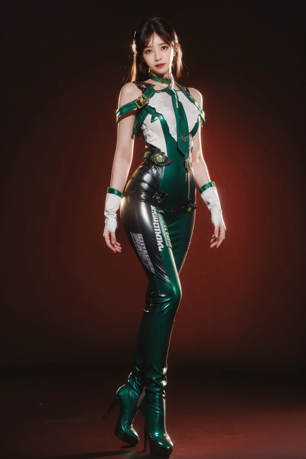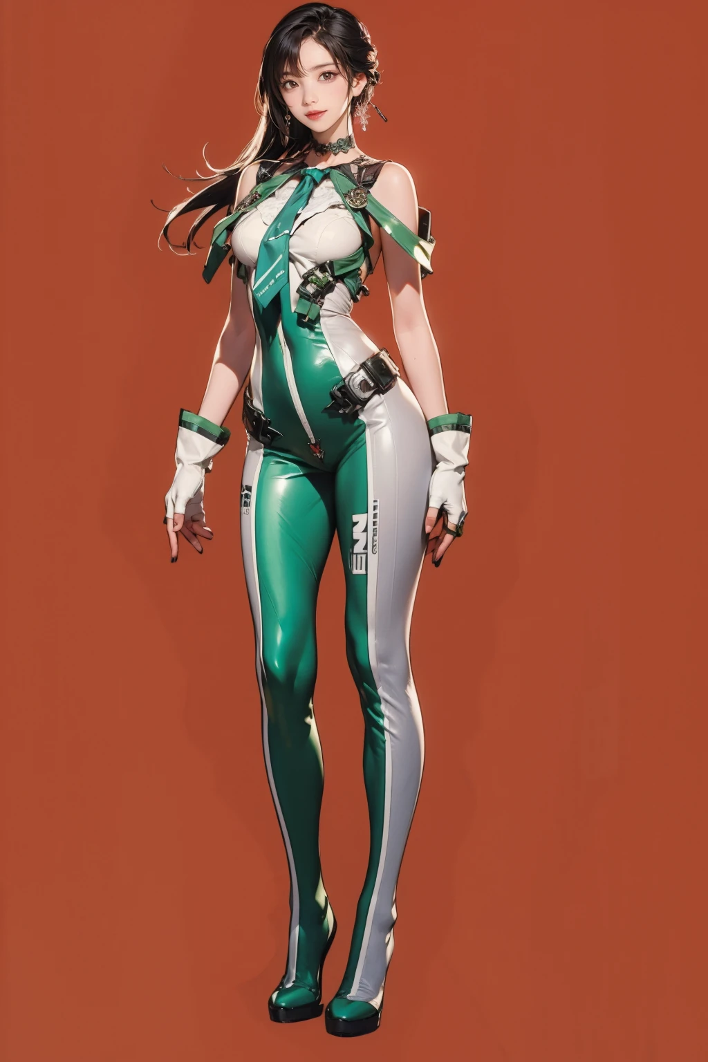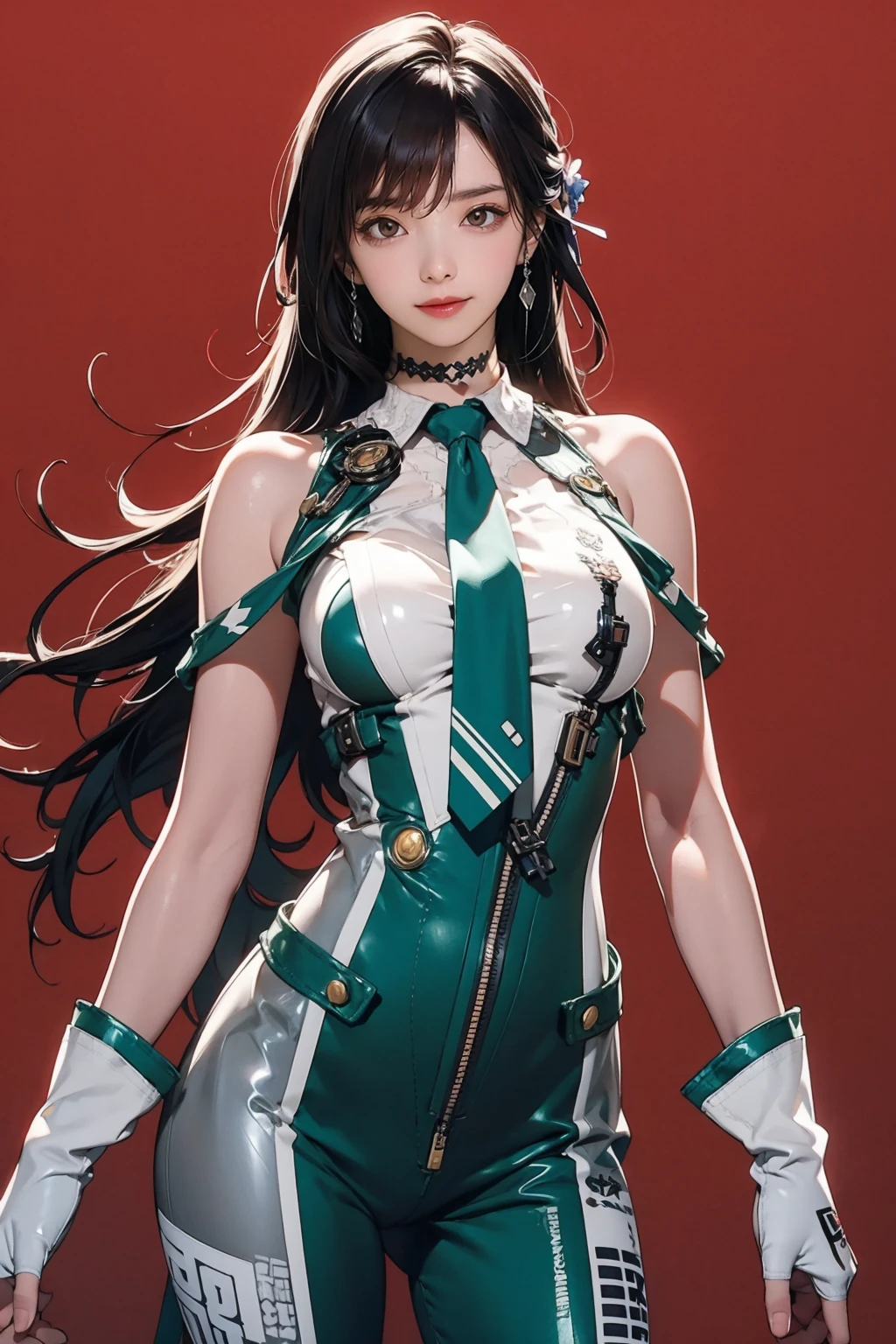 green bodysuit,green necktie,choker,see-through,fingerless gloves,clothes writing,mechanical parts,white gloves