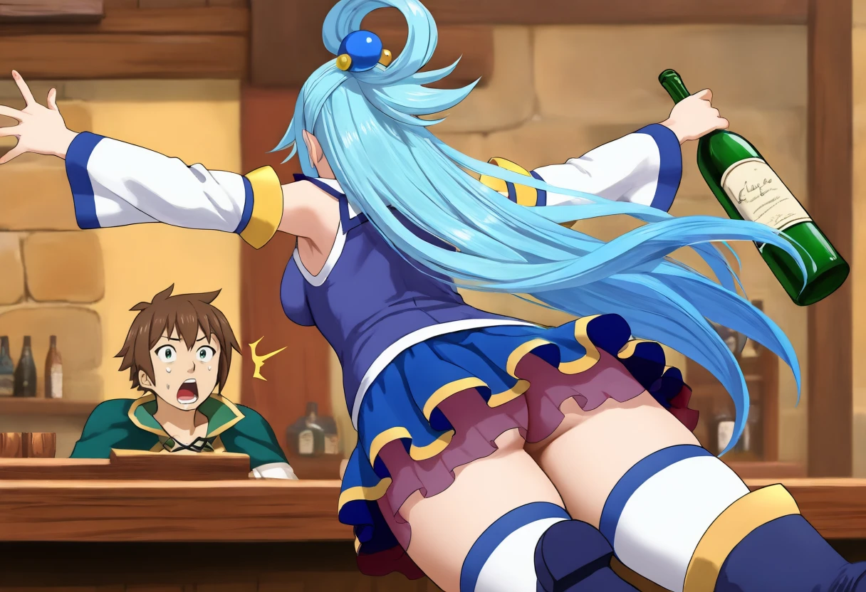Trigger words: indoors, open mouth, surprised, scared, <character 1>, from behind, jumping, spread arms, <character 2>