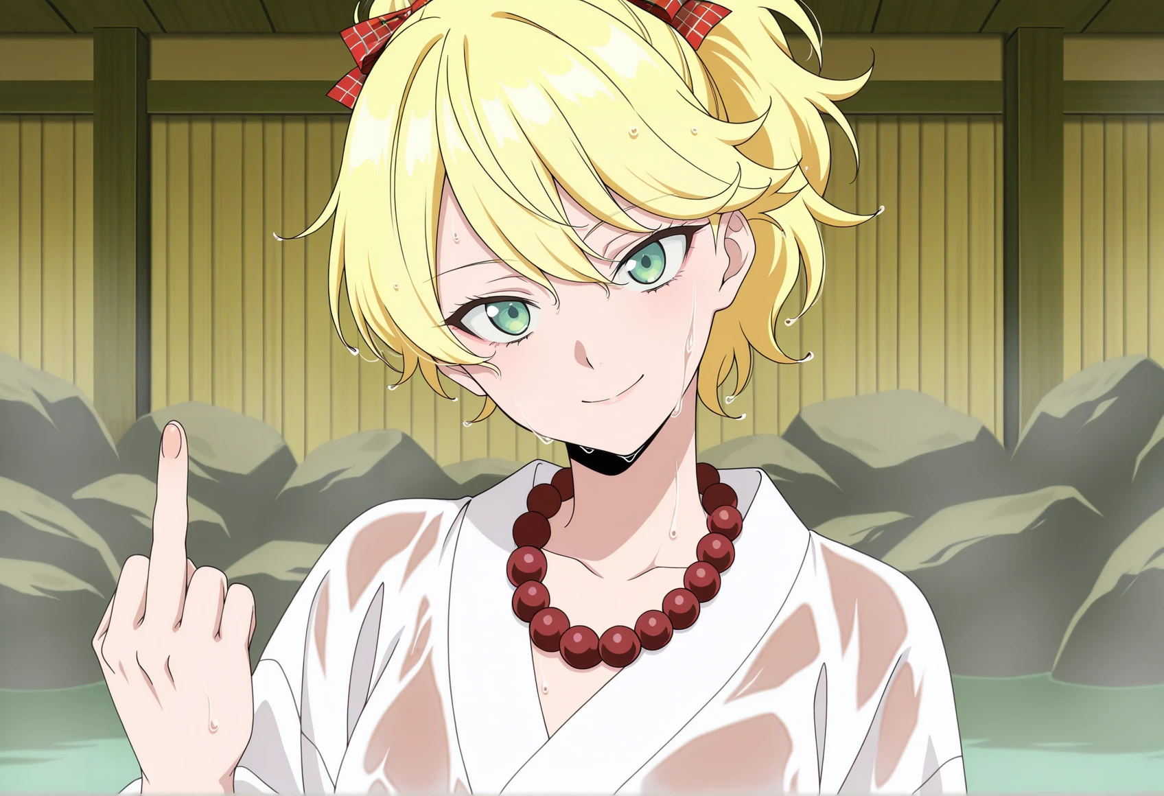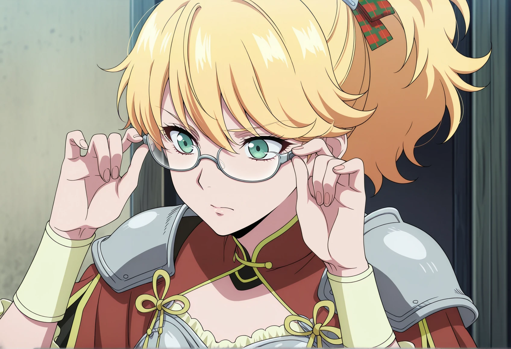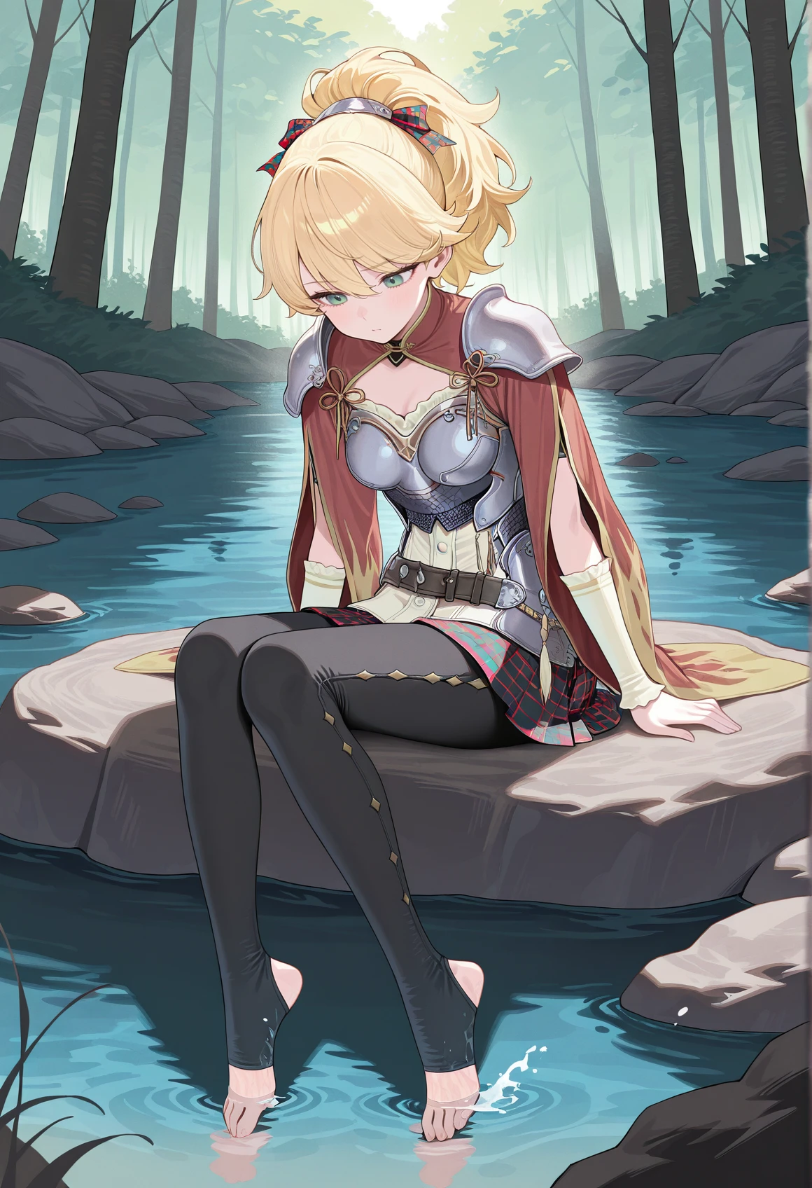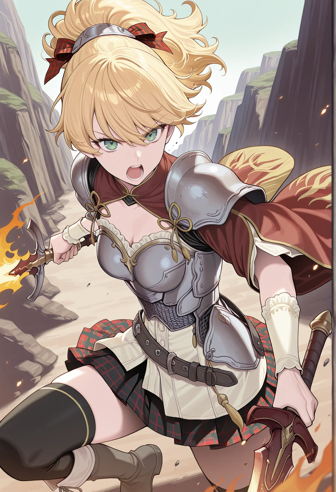 green eyes, blonde hair, ponytail, checkered hair ribbon, shoulder pads, armor, breastplate, wristband, long sleeves, sleeve slit, checkered skirt, belt, black leggings, boots
