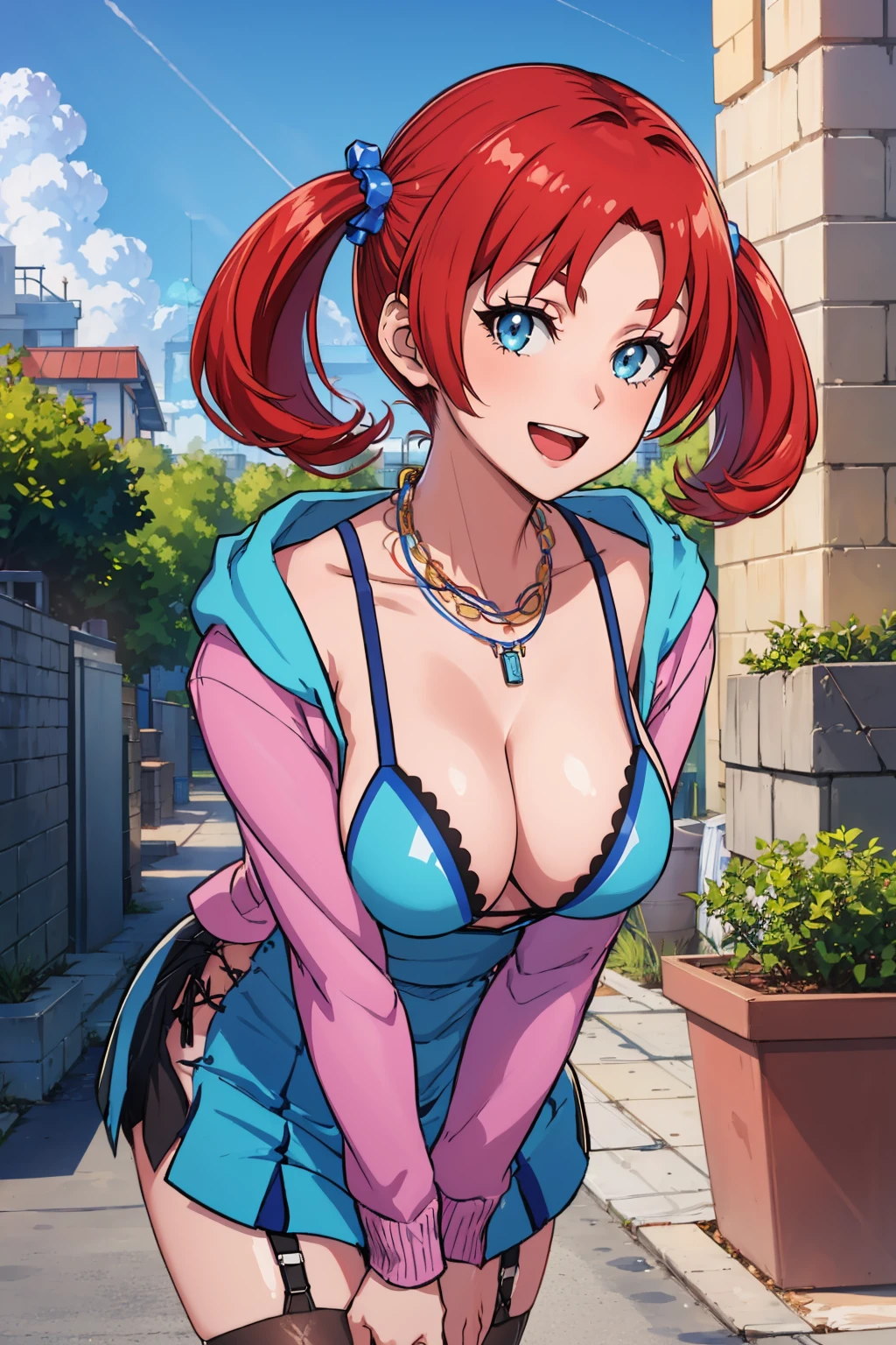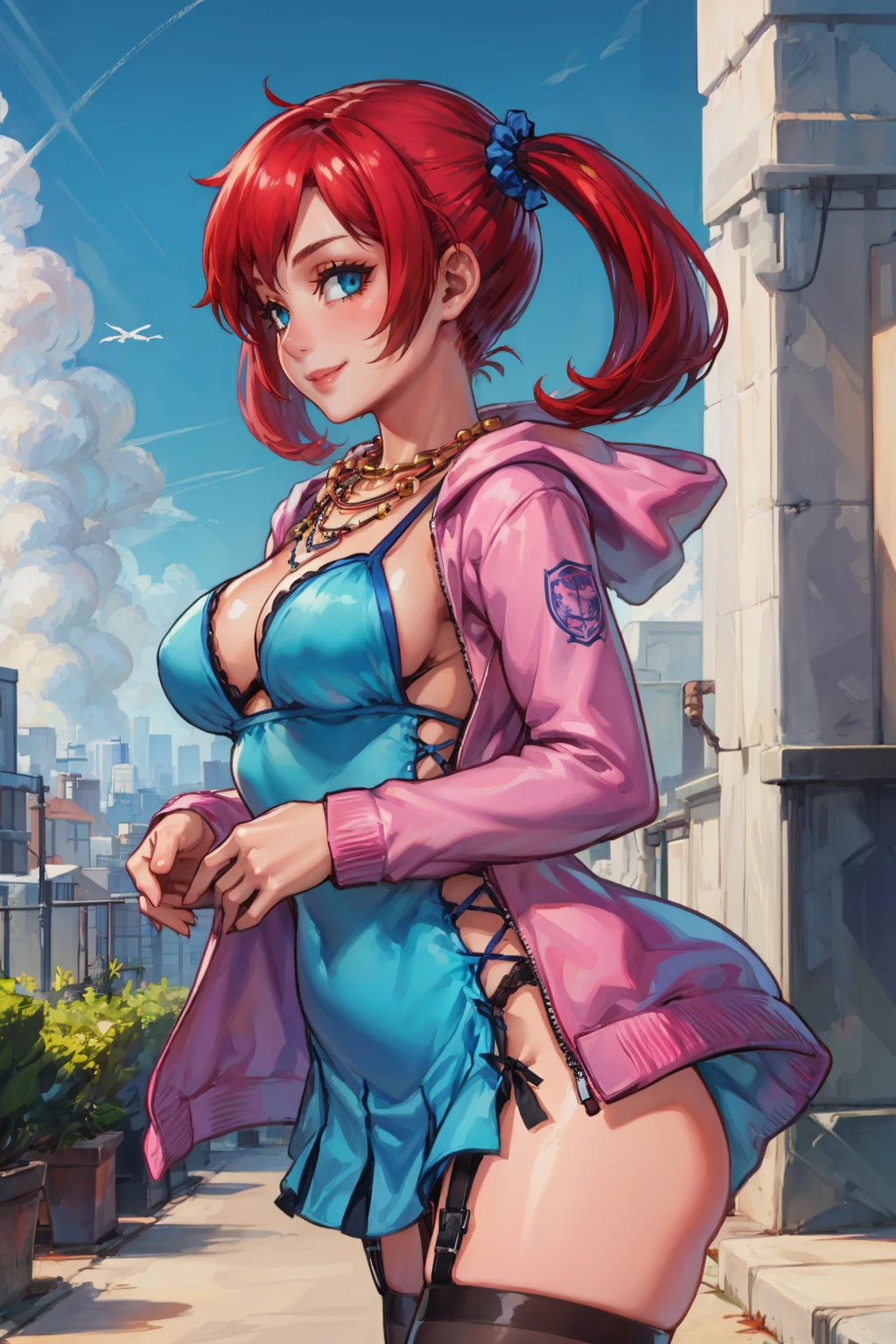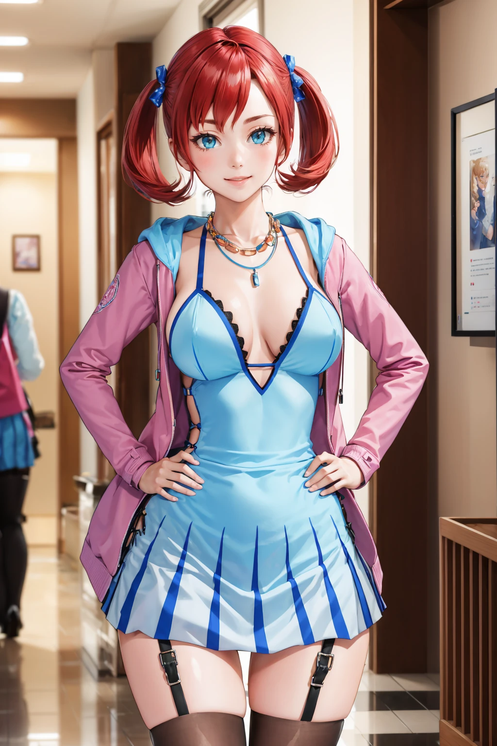 Add "necklace, teal dress, cleavage, pink jacket, short dress, garter straps, black thighhighs" for her typical look.