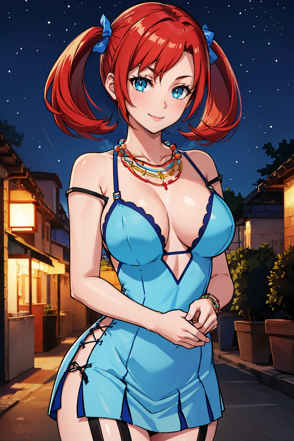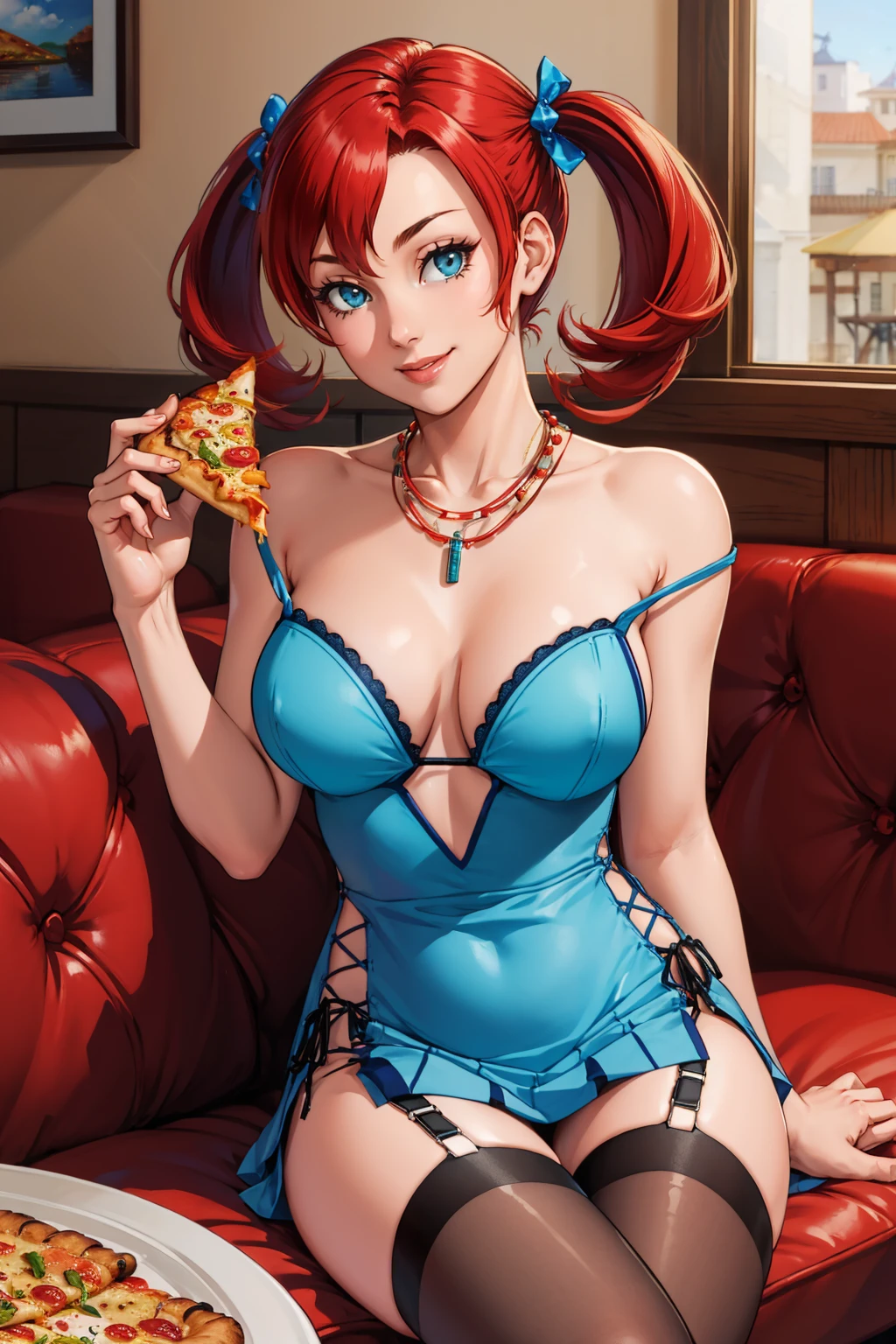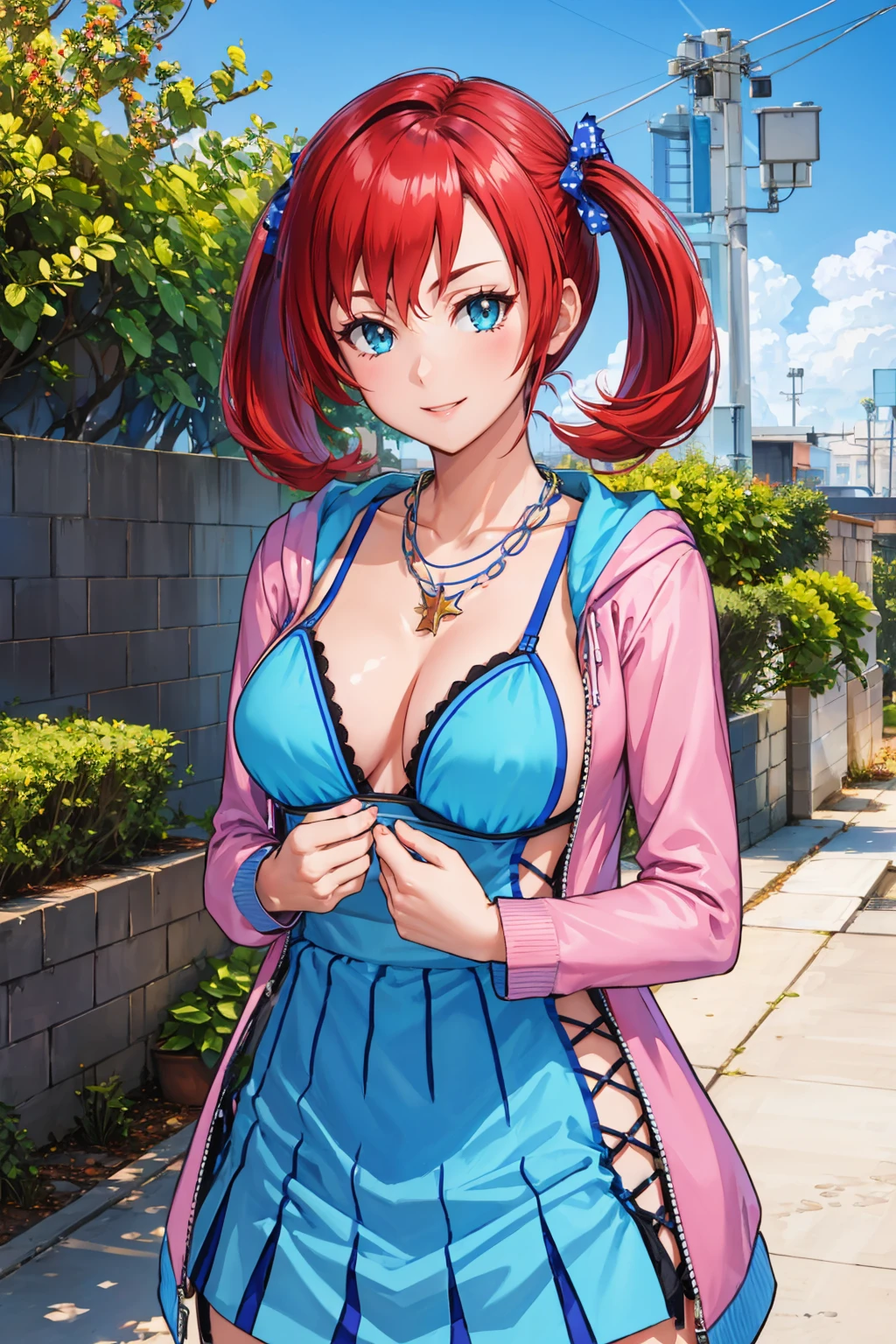 Add "necklace, teal dress, cleavage, pink jacket, short dress, garter straps, black thighhighs" for her typical look.