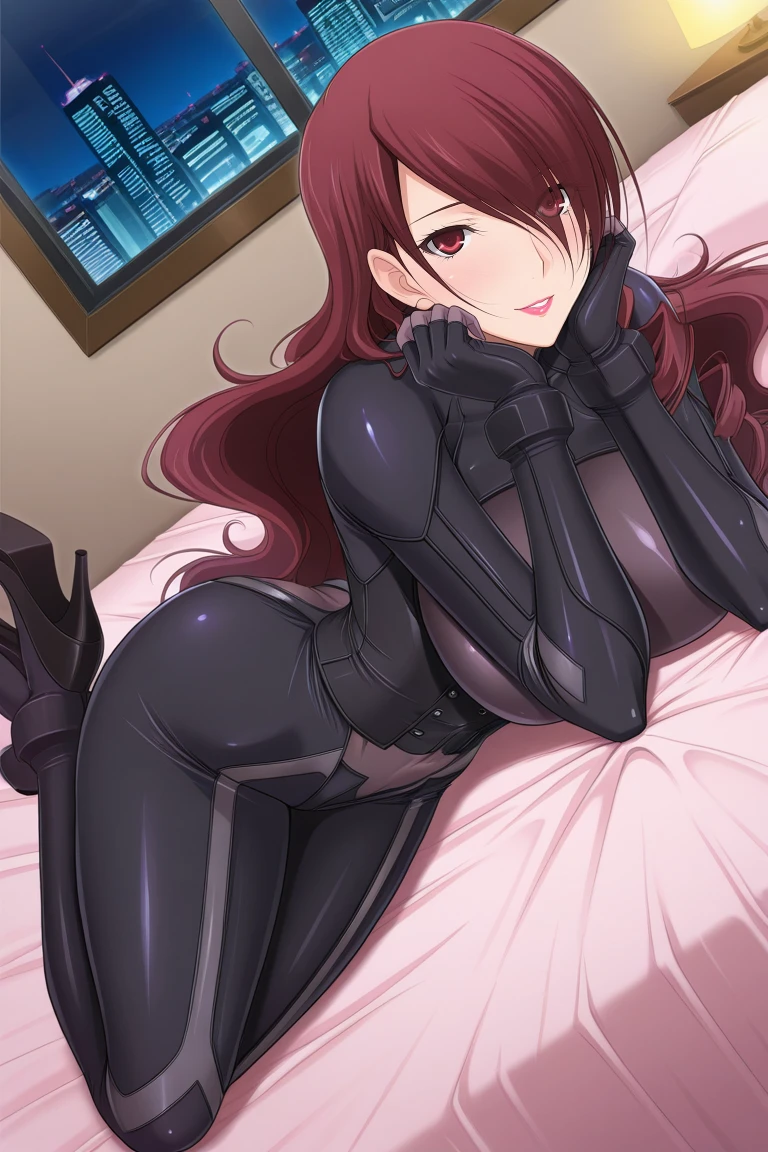 mitsuru-bodysuit, black bodysuit, corset, framed breasts, skin tight, impossible clothes, gloves, high heels,
