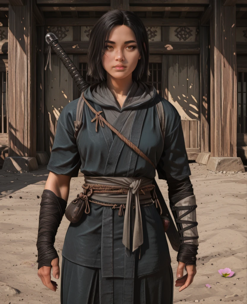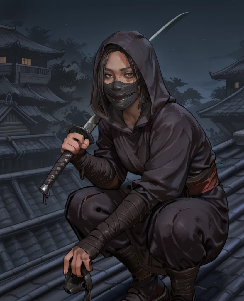 robes, or ninja, arm wraps, or gauntlets, hood, red sash,