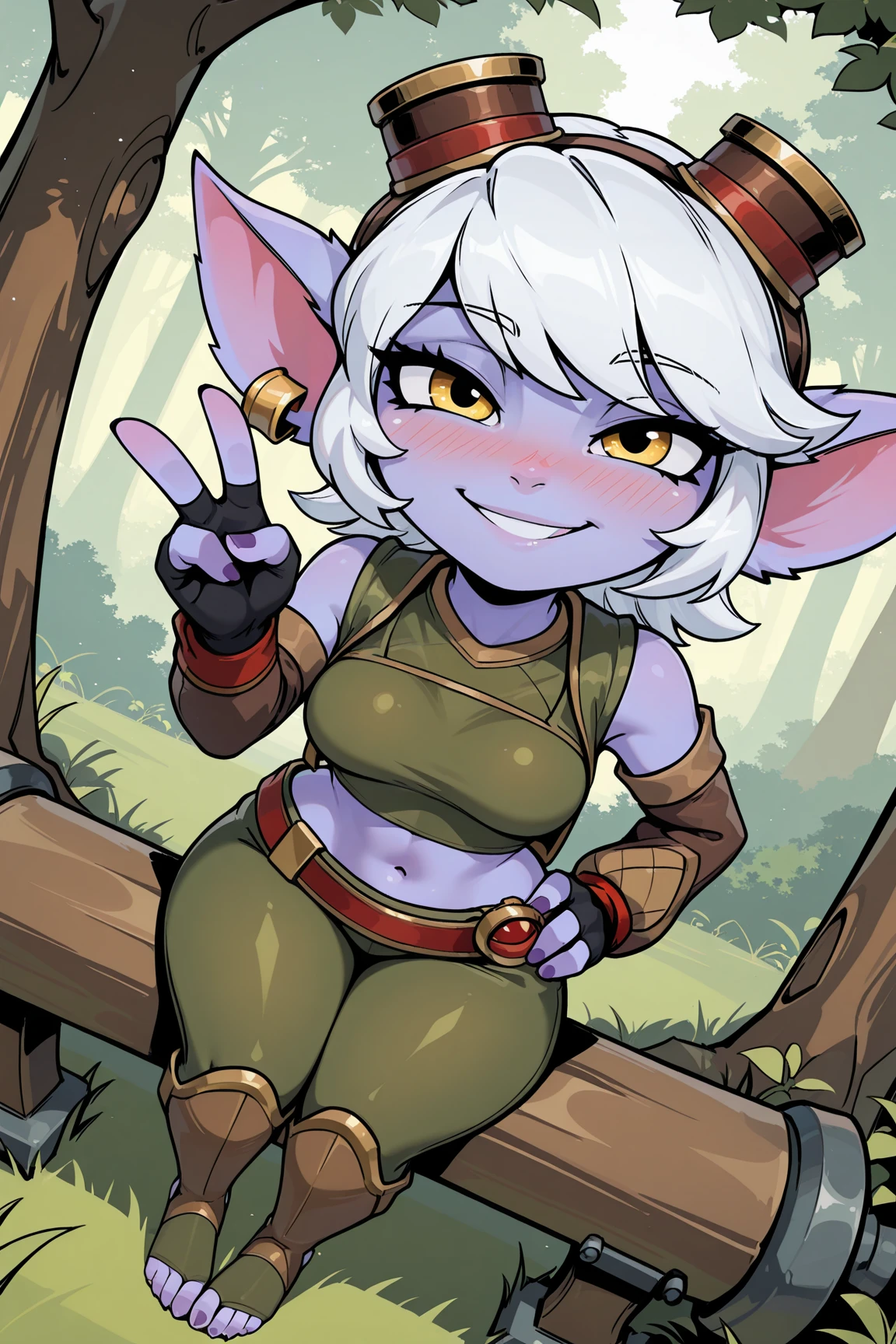 ➜ TristanaLOLIXL, yordle, shortstack, purple skin, colored skin, yellow eyes, white hair, short hair, bangs, single earring, goggles on head, pointy ears, medium breasts, green midriff, detached sleeves, brown sleeves, black gloves, fingerless gloves, red belt, green legwear, toeless legwear]--|======[ 💗 My Settings: 💗 ]======|--[