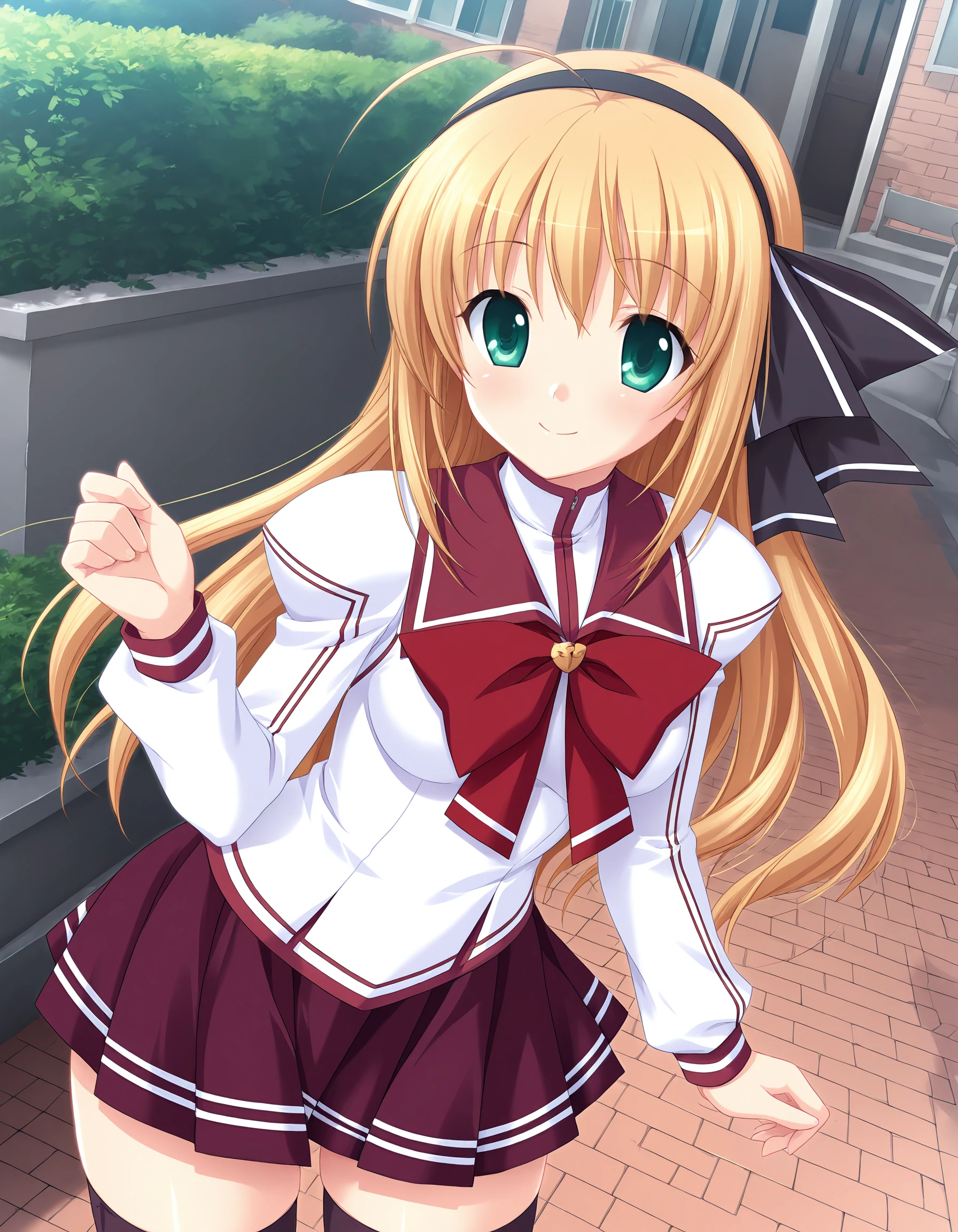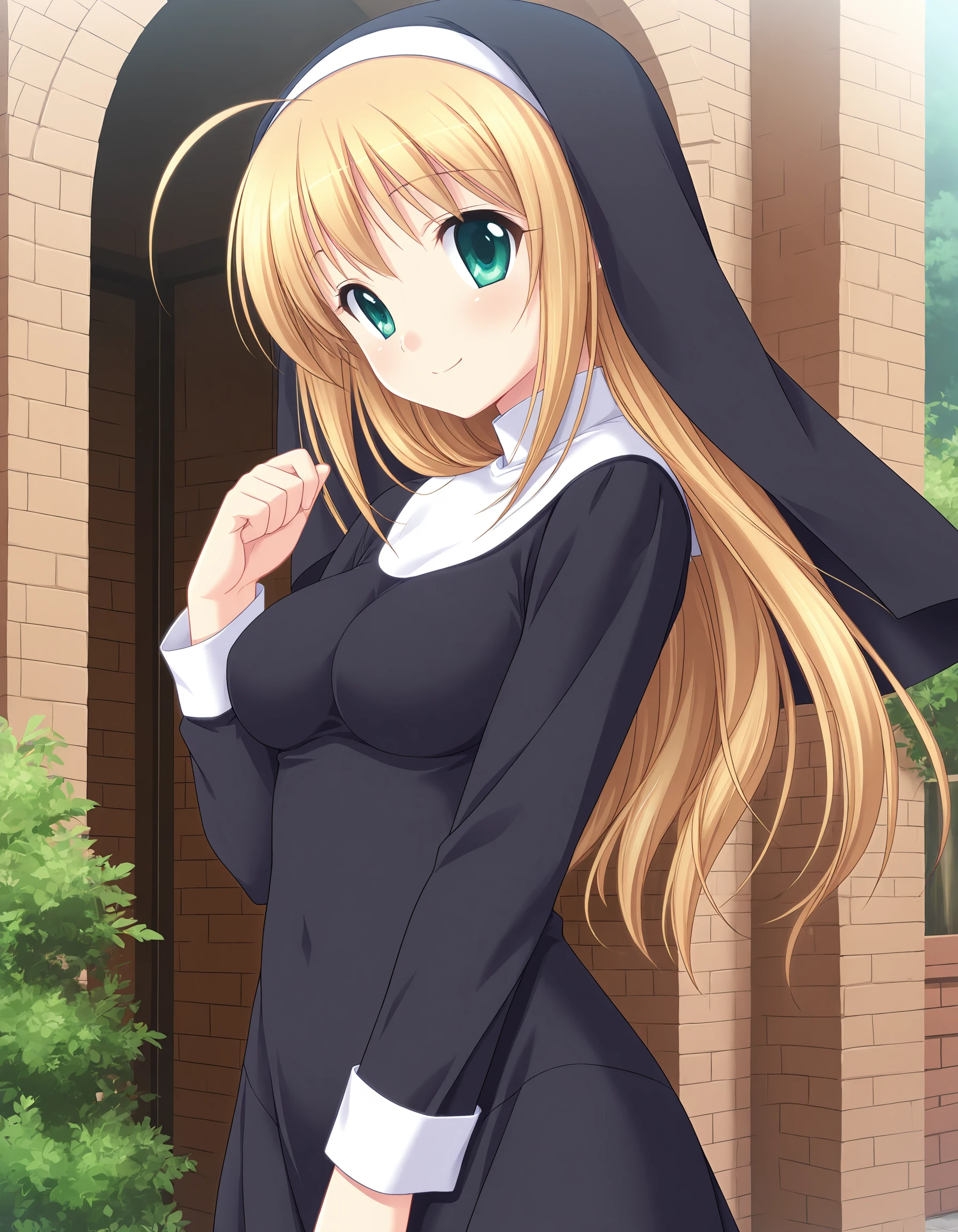 shizuka, blonde hair, long hair, ahoge, green eyes, medium breasts,
