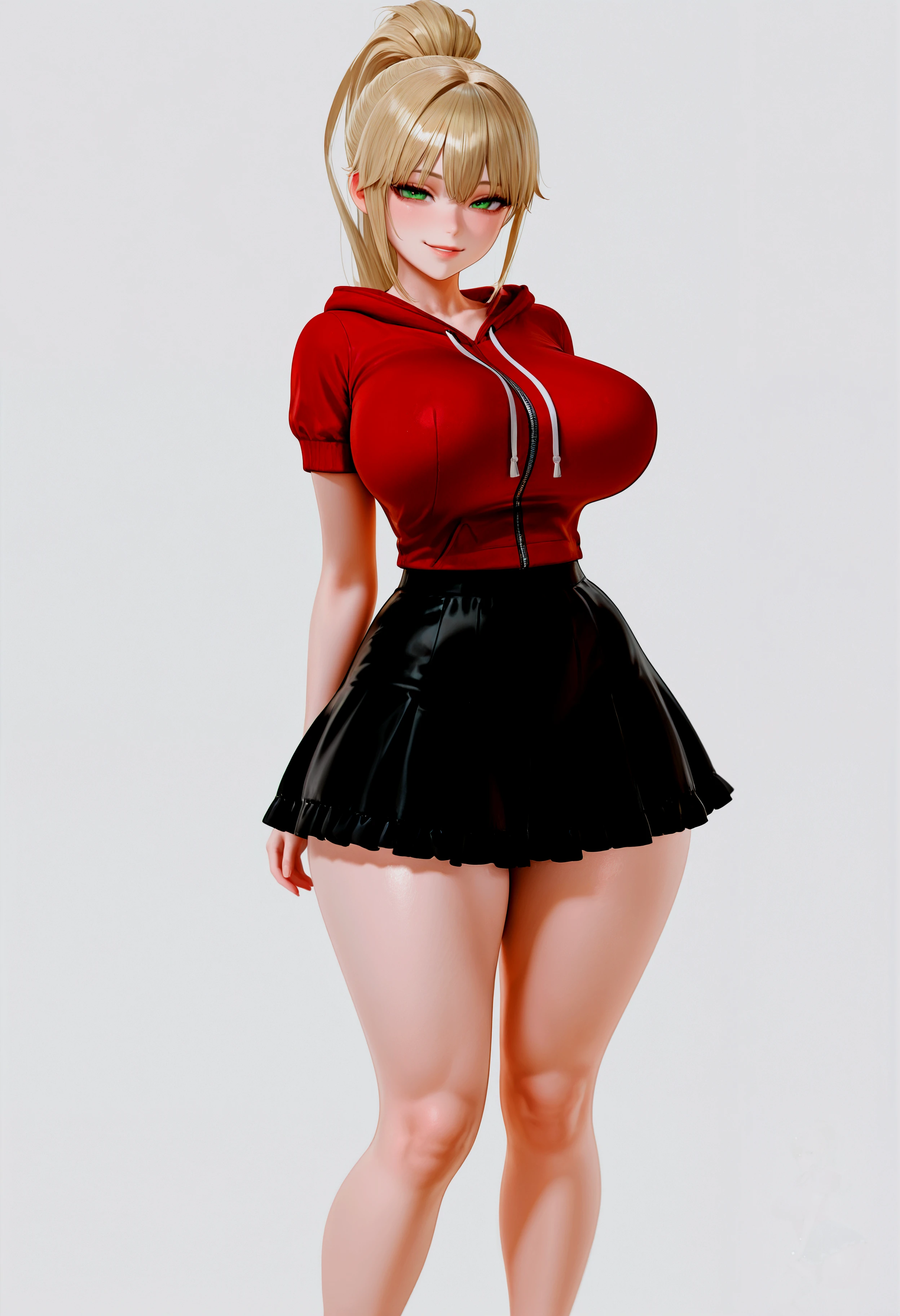 1girl, green eyes, pale skin, dirty blonde hair, high ponytail, sidelocks, long hair, bangs, huge breasts, wide hips, (thick thighs:1.2),