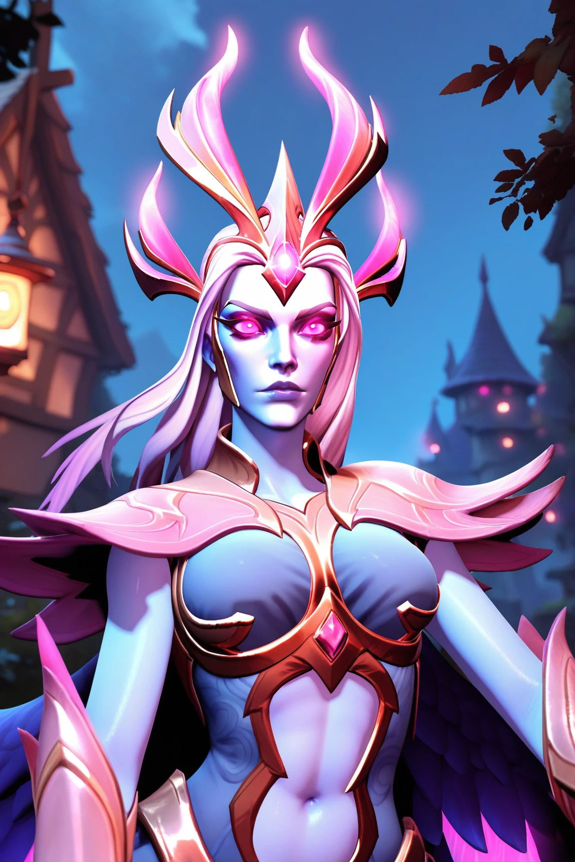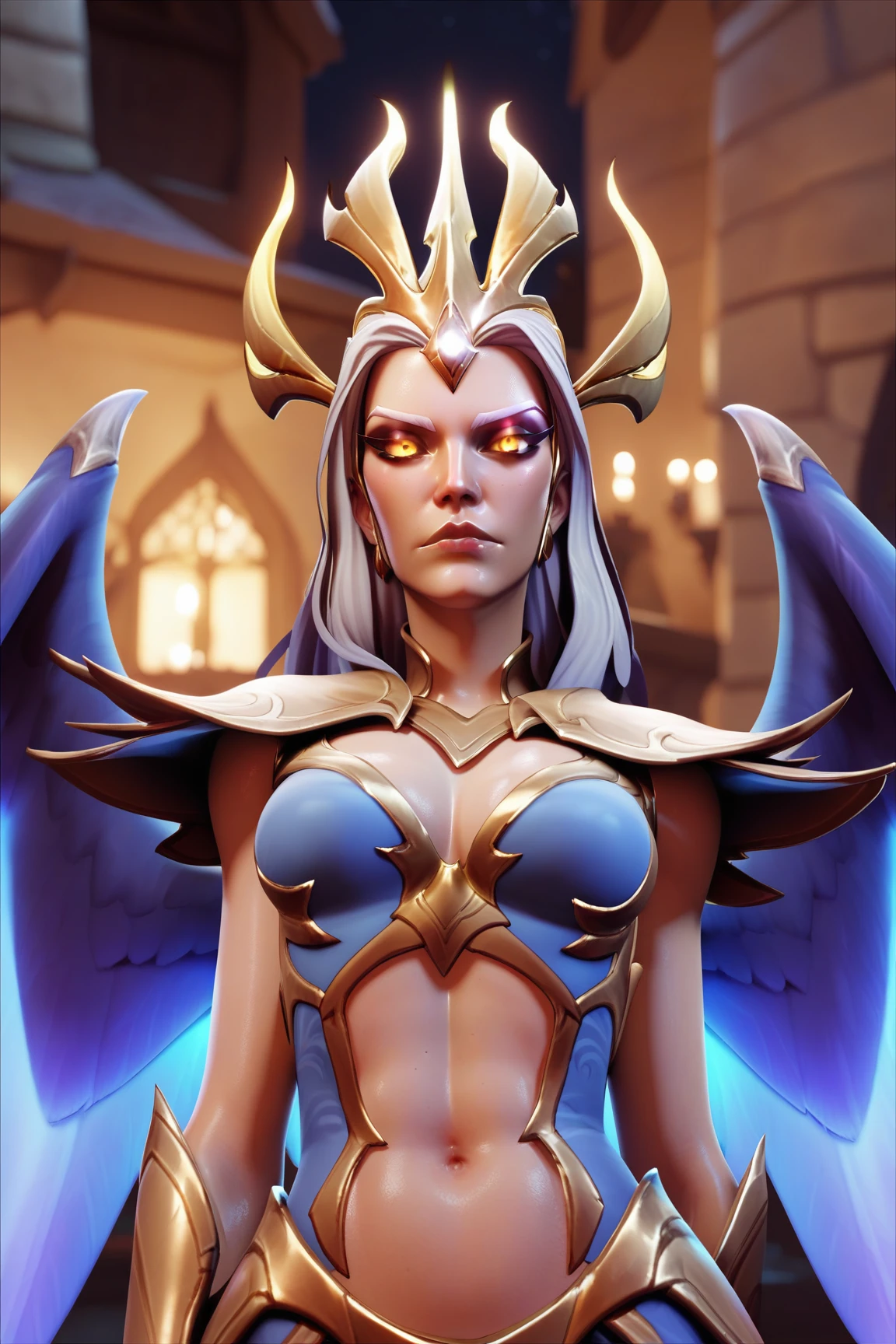 vengeful_spirit_arcana, navel cutout, wings, crown,