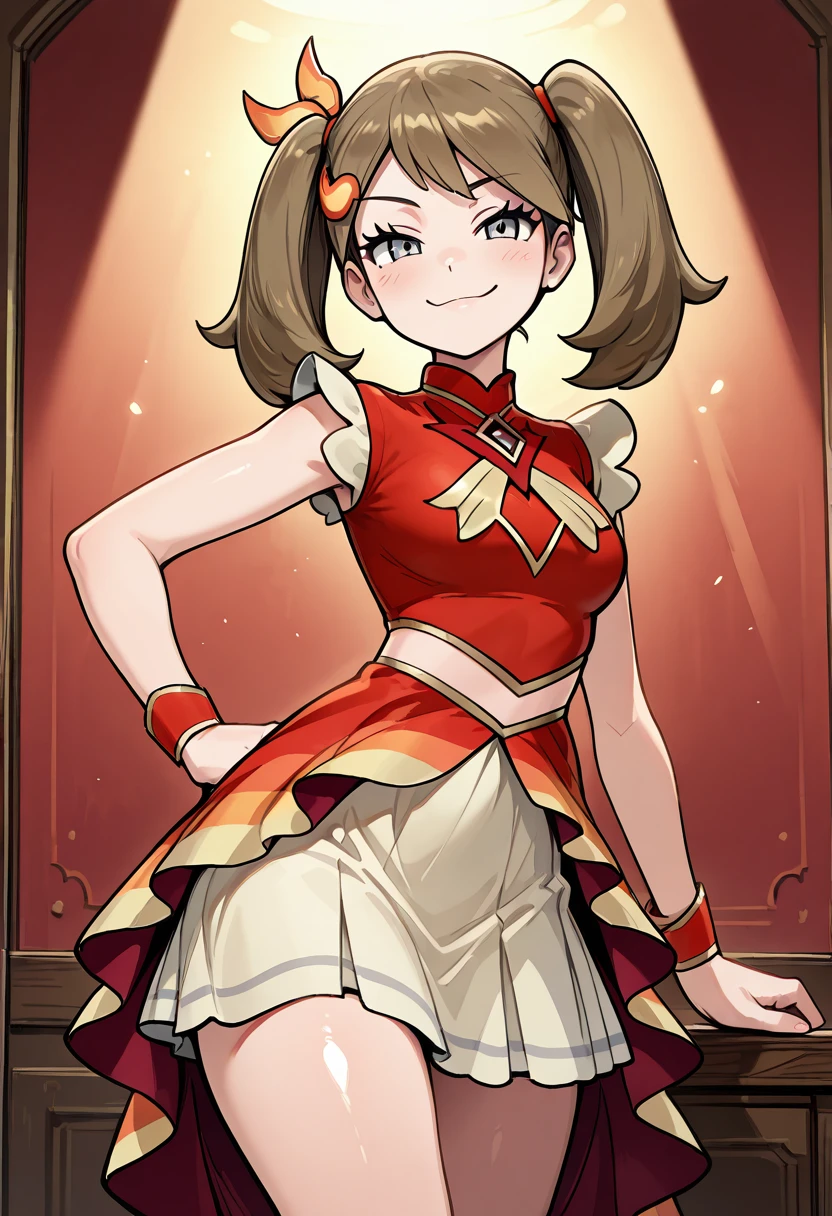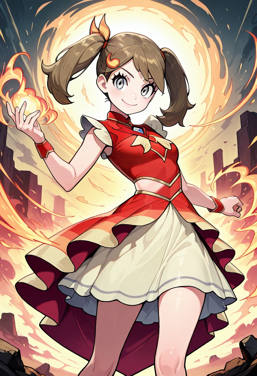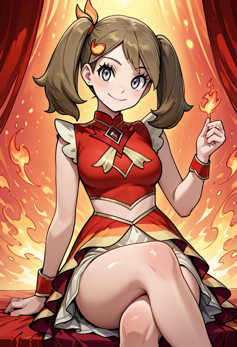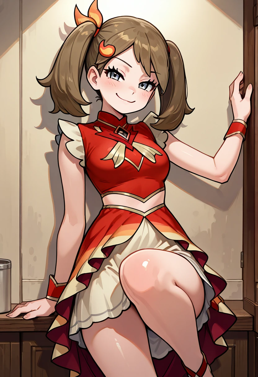zzMaySygna, grey eyes, brown hair, medium hair, twintails, hair ornament, jewelry, red dress, sleeveless, wristband, wrist cuffs, bracelet,