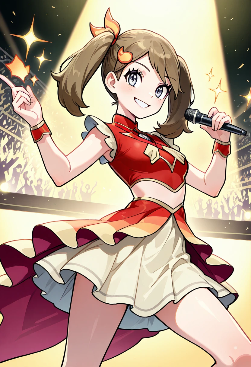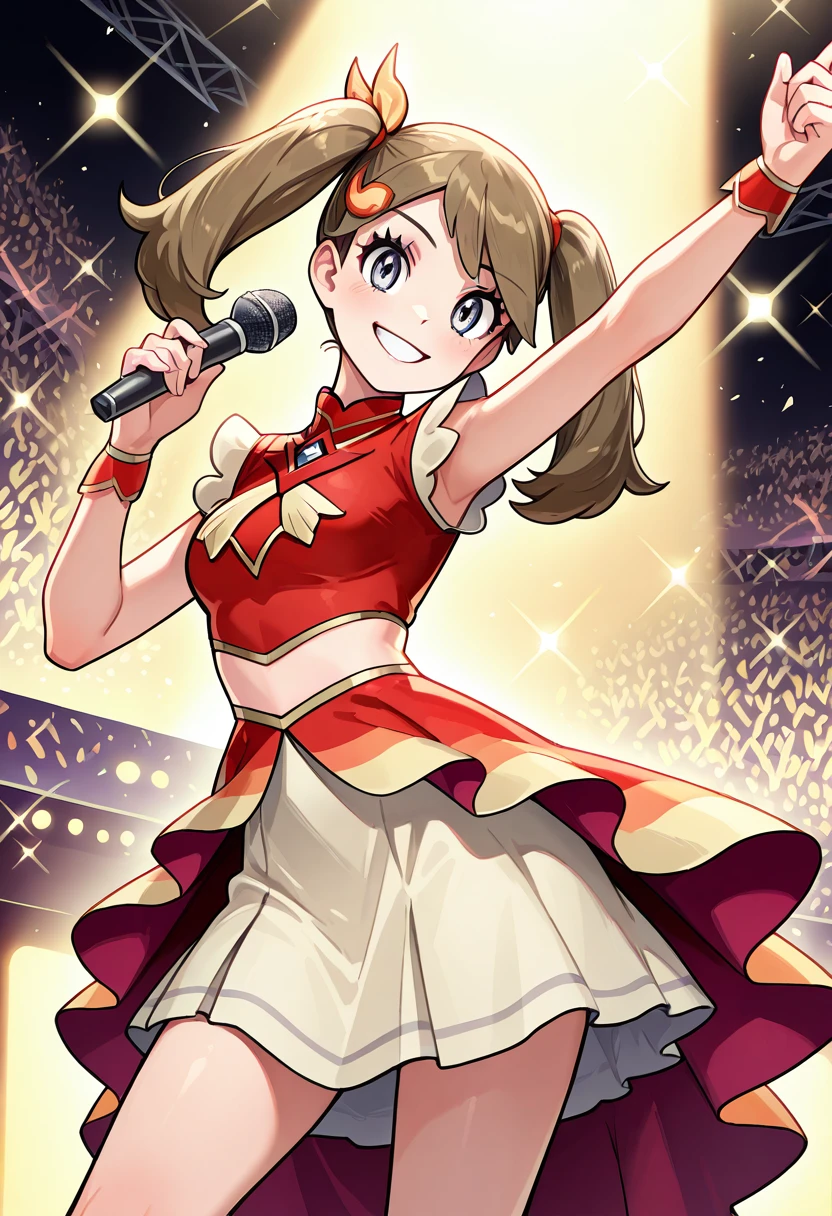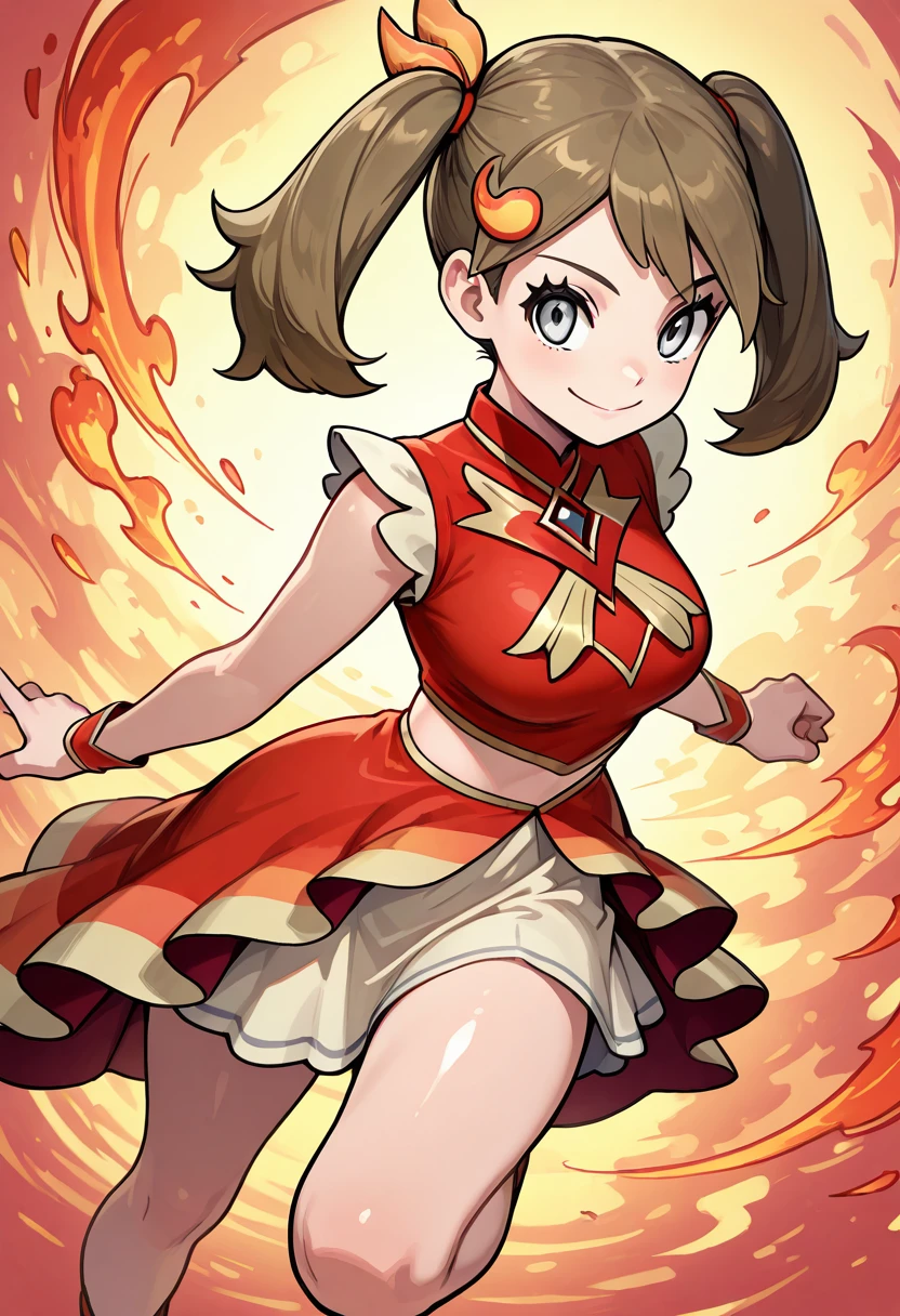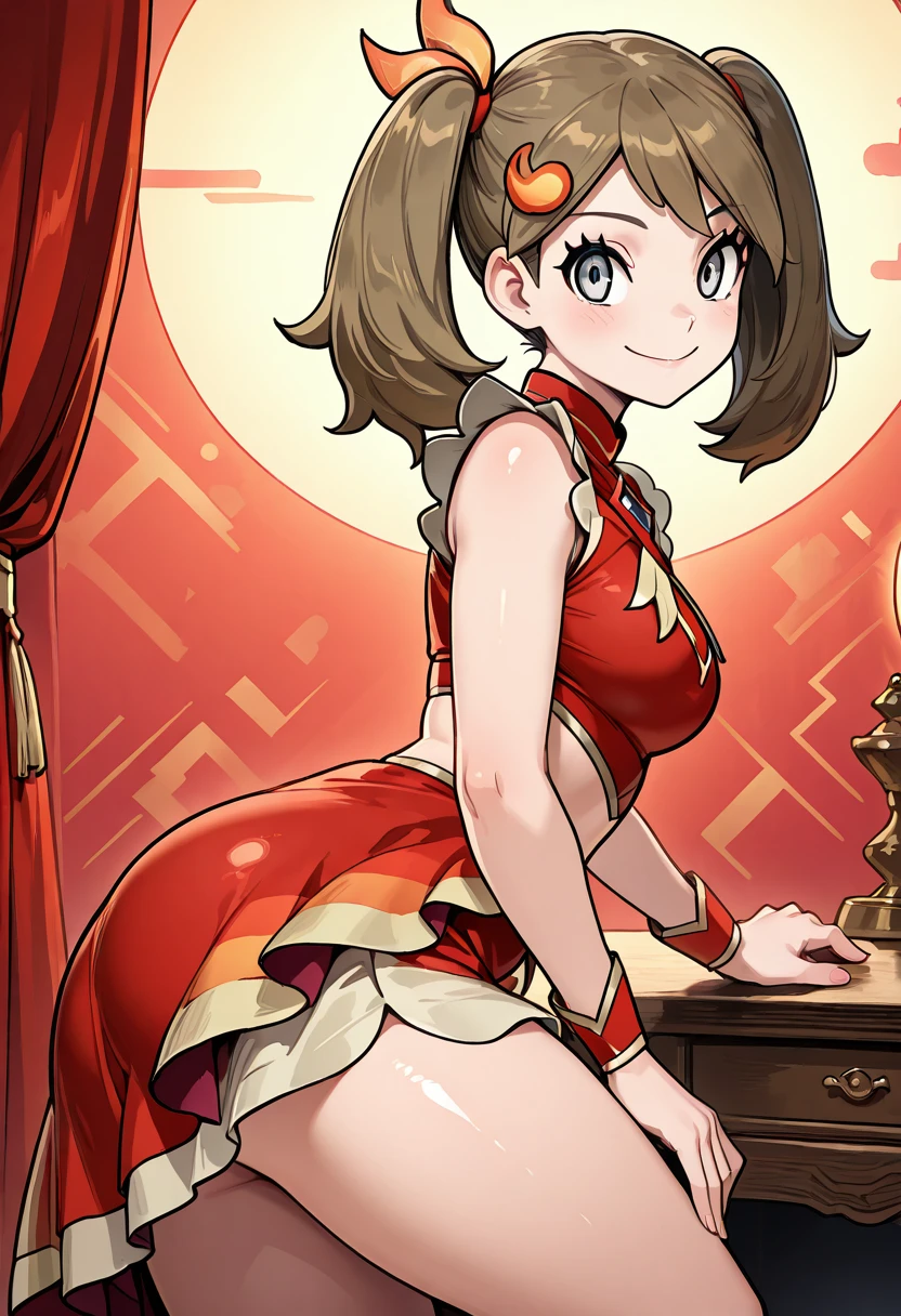zzMaySygna, grey eyes, brown hair, medium hair, twintails, hair ornament, jewelry, red dress, sleeveless, wristband, wrist cuffs, bracelet,