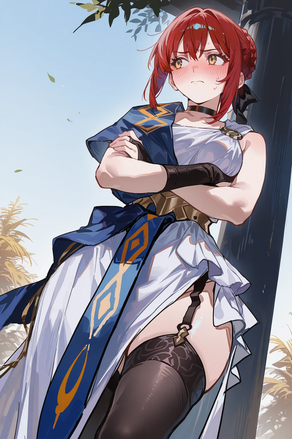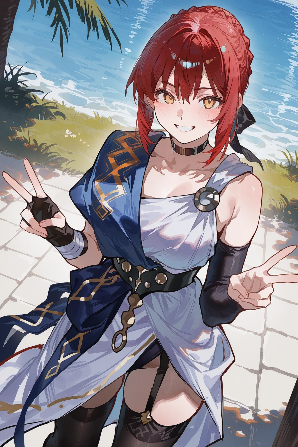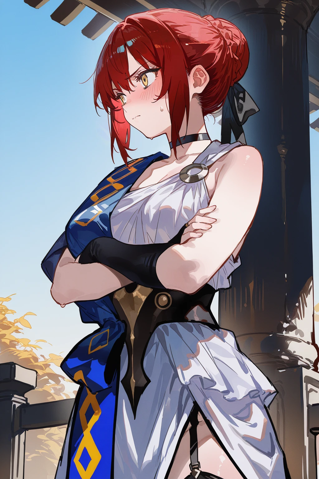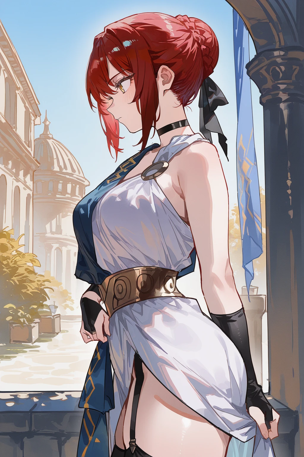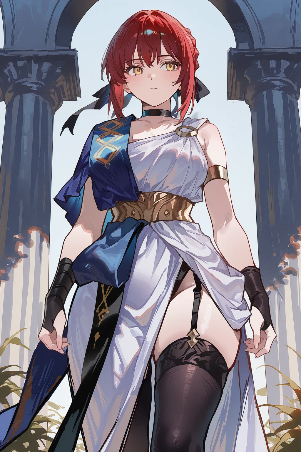Clothes: ancient greek clothes, choker, bridal gauntlets, fingerless glove, single bridal gauntlet, white dress, blue shoulder sash, sash, black ribbon, black thighhighs, garter straps, stola.