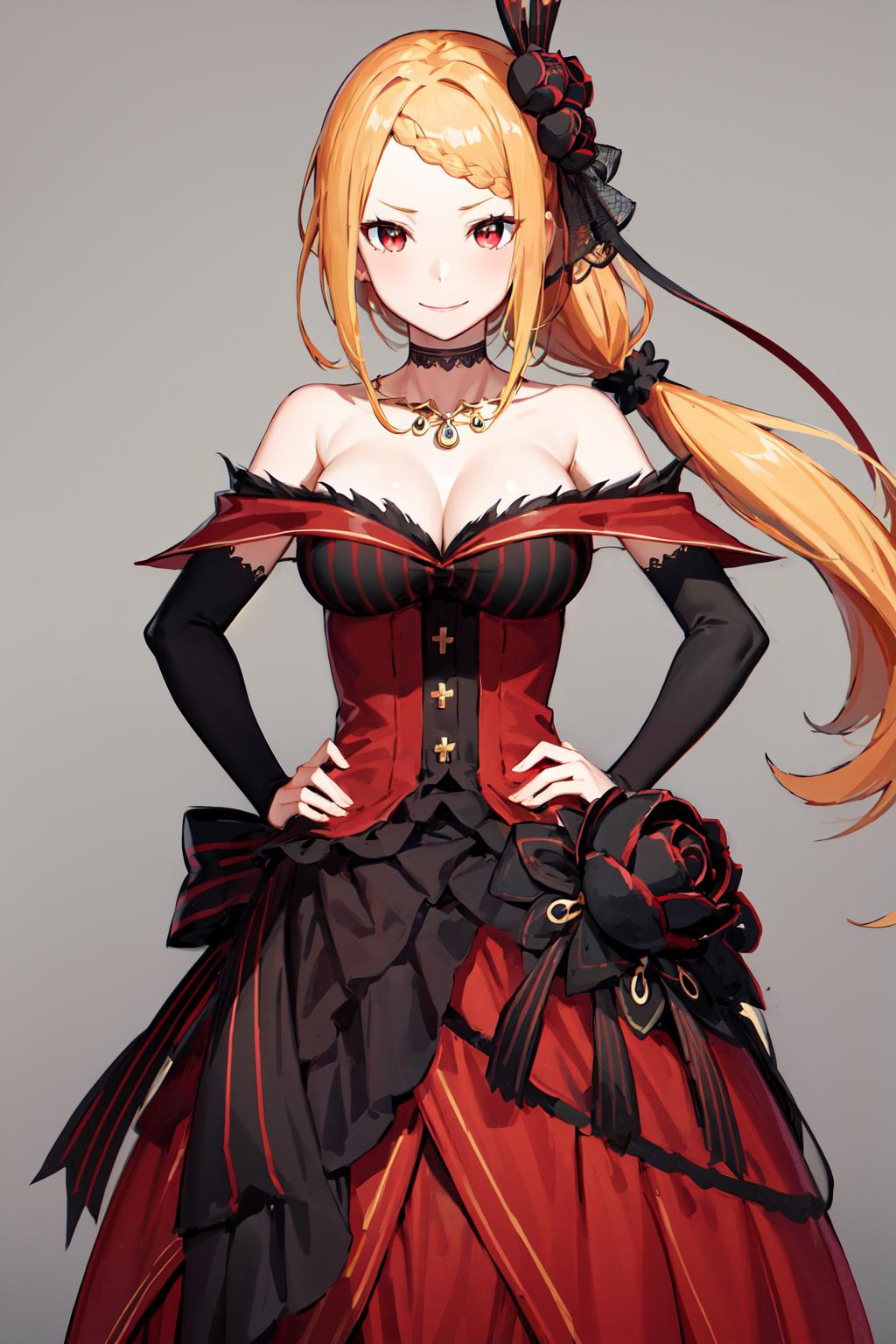 hmpris, long hair, braided bangs, low ponytail, hair ornament, choker, collarbone, necklace, cleavage, bare shoulders, red dress, detached sleeves, black sleeves