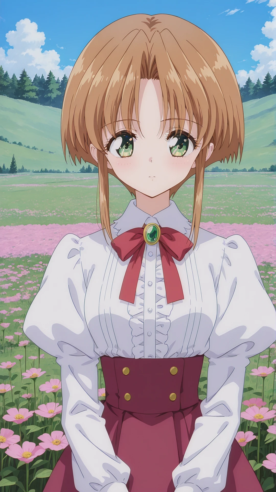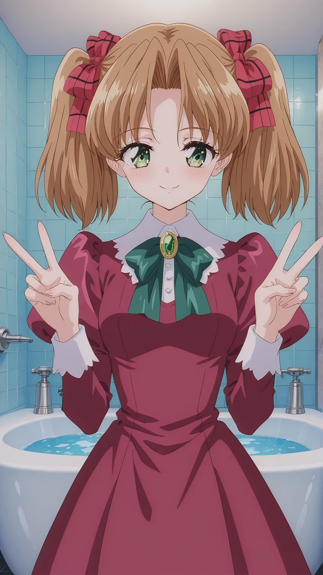 ai_doll, brown hair, green eyes, twintails, ribbon, small breasts