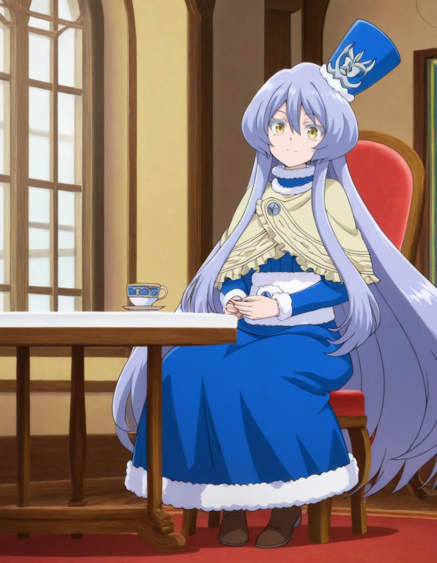 very long hair, top hat, princess outfit, blue dress, brown capelet, long dress, fur trim, long sleeves, brown footwear