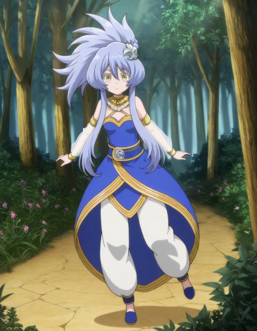long hair, spiked hair, asymmetrical hair, hair ornament, princess outfit 2, arabian clothes, gold trim, gem, neck ring, blue dress, sleeveless, see-through sleeves, bracelet, belt, pelvic curtain, baggy pants, ankle strap, blue footwear
