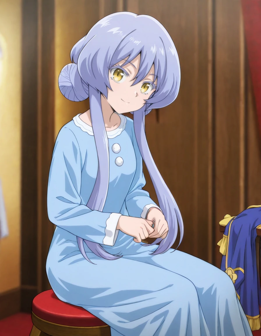 short hair, double bun, pajamas, blue dress, long sleeves, long dress, blue footwearOutfit - School Uniform
