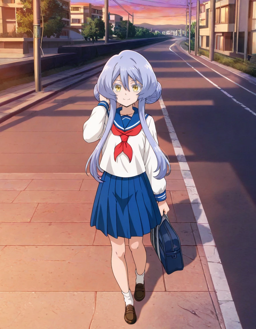 short hair, double bun, school uniform, serafuku, blue sailor collar, white shirt, red neckerchief, long sleeves, blue pleated skirt, white socks, brown loafersDescription