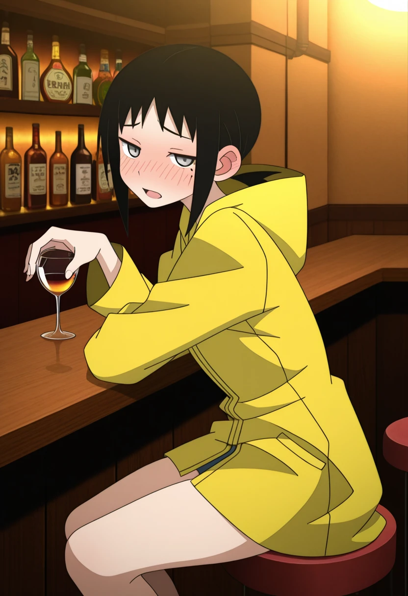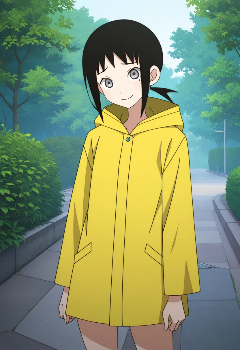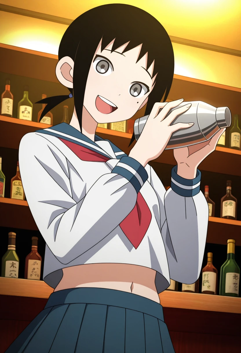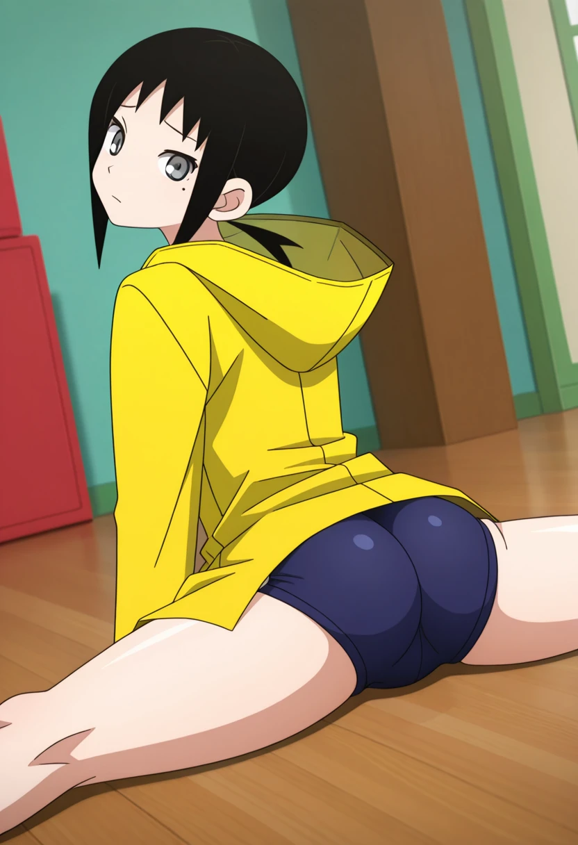 aiww, grey eyes, black hair, short hair, short ponytail, low ponytail, sidelocks, mole under eye,